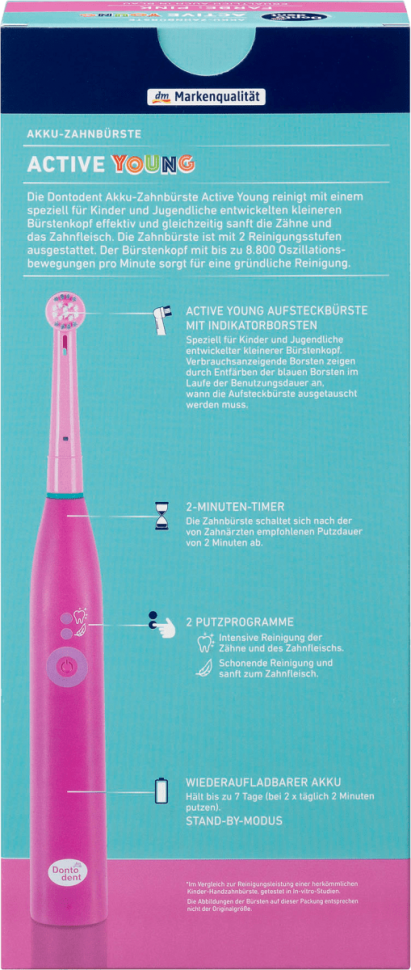 При этом насадочные щетки подходят для всех зубных щеток Dontodent-Active Battery.
