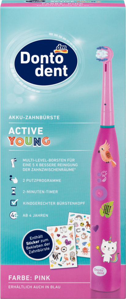 Только самое лучшее для маленьких: аккумуляторная зубная щетка Dontodent Active Young от Dontodent просто лучше. Таким образом, исследование в пробирке показало, что оно обеспечивает до 5 раз лучшую чистку зубных промежутков по сравнению с производительностью чистки традиционной детской ручной зубной щетки.