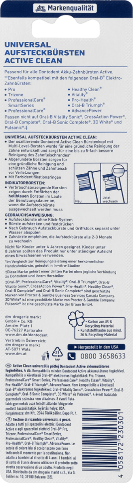 Der ozillierende DONTODENT Active Clean Bürstenkopf mit Multi-Level-Borsten wurde für eine gründliche Reinigung der Zähne entwickelt und sorgt für eine bis zu 5-fach bessere Reingung des Zahnfleischrandes.* Abgerundete Borsten sorgen für eine gründliche Reinigung und schützen Zähne und Zahnfleisch vor Verletzungen. Verbrauchsanzeigende Borsten zeigen durch Entfärben der grünen Borsten im Laufe der Benutzungsdauer an, wann die Aufsteckbürste ausgewechselt werden muss. *Im Vergleich zur Reinigungsleistung einer herkömmlichen Handzahnbürste, getestet in in-vitro-Studien. Für die Vorgänger-Akku-Zahnbürsten (Professional Clean Plus, Akku und Akku-KIDS) bleiben die 5er basic-Wechselköpfe weiterhin im Sortiment. Die neuen DONTODENT ACTIVE-Aufsteckbürsten passen nicht auf die Vorgängermodelle.