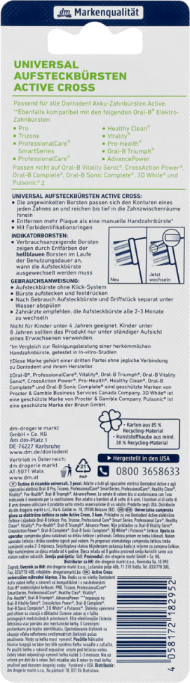 Изогнутые щетинки щеток Dontodent Active Cross соответствуют контурам каждого зуба и простираются глубоко в промежутки между зубами. Щетинки, показывающие расход, показывают, когда необходимо заменить вставную щетку, обесцвечивая светло-голубую щетину в течение срока службы.