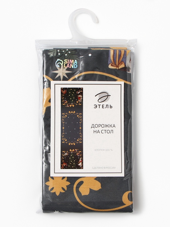Производитель: Этель; Габариты: 21 x 22 x 1,5; В боксе: 80 шт; Размер, см: 40 х 149; Рекомендации по уходу: Деликатный режим отжима, Не отбеливать, Стирка при 30 °С, Глажка при 110 °С; Страна: Россия; Состав: Хлопок 100%; Материалы: хлопок; Фасовка: по 1 шт; Сертификат: ЕАС; Набор: Нет; Цвет: Чёрный; Форма: Прямоугольная; Ткань: Саржа; Плотность, г/м²: 190; Сезон: Зима; Тип основы: Тканевая основа; Тематика: Новогодняя; Вид упаковки: Пакет; Рисунок: Да; Тематика праздника: Новый год; Декоративные элементы: Без элементов; Состав ткани: Хлопок; В подарочной упаковке: Нет; Влаго-грязе-масло отталкивающая пропитка: Нет