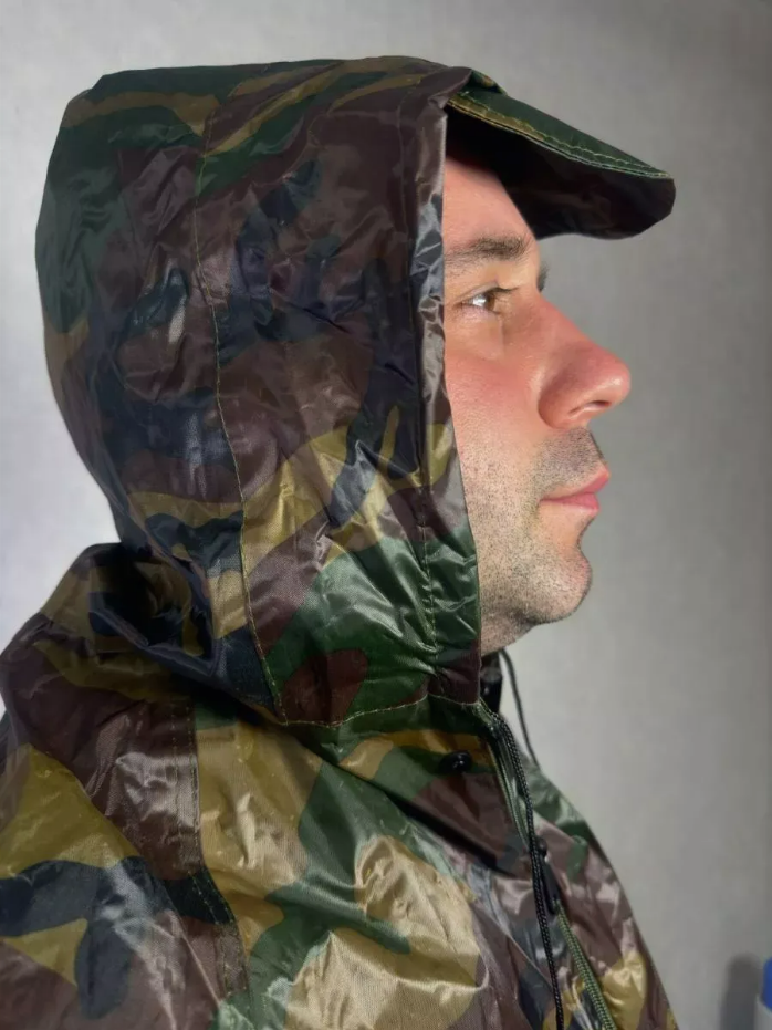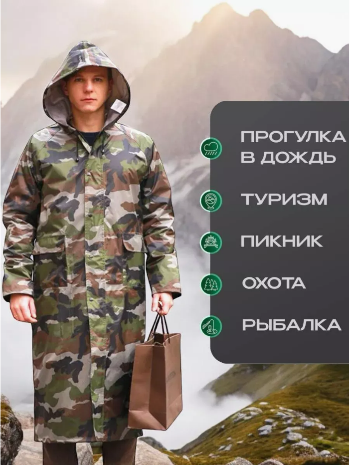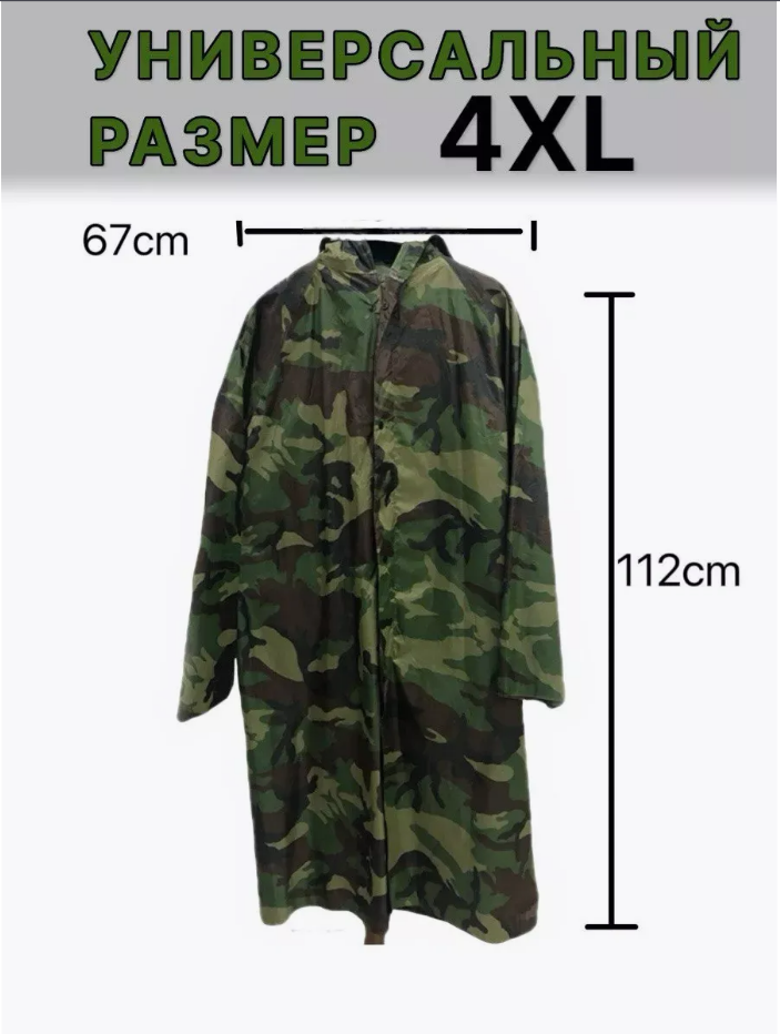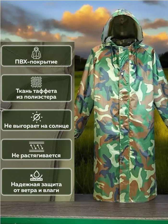 Дождевик милитари мужской это верхняя одежда, предназначенная для защиты от непогоды, длительного воздействия воды,дождя и грязи, а также всевозможных агрессивных сред. Средство защиты изготавливается из специальной смесовой ткани из полиэстра пвх имеющую водостойкость 3000 мм. Дождевик оснащен капюшоном с козырьком и хлястиками, что является дополнительной защитой от пыли, грязи, комаров. Плащ также имеет светоотражающие элементы, которые повышают видимость в условиях плохой освещенности, и карманы для удобства хранения мелочей.