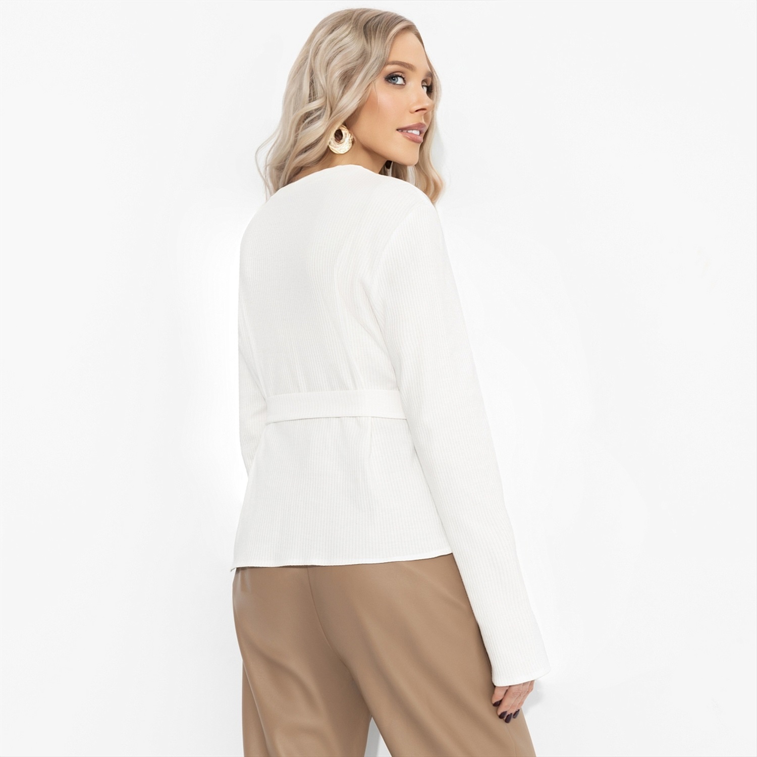 Джемпер в главном оттенке 2026 года по версии Pantone – Cloud Dancer – говорит о женственности без лишних слов. Воздушный белый транслирует окружающим твое абсолютное спокойствие и уверенность, а акцентный вырез добавляет провокации: дерзко, стильно, на ваших условиях. С брюками или юбкой легко получится образ, который покоряет с первого взгляда. Джемпер из хлопка: ткань плотная, гладкая, дышащая, эластичная, держит форму без деформаций. Полуприлегающий силуэт со спущенной линией плеча удлиняет шею. Асимметричный запах с поясом подчеркивает талию.