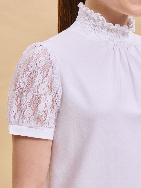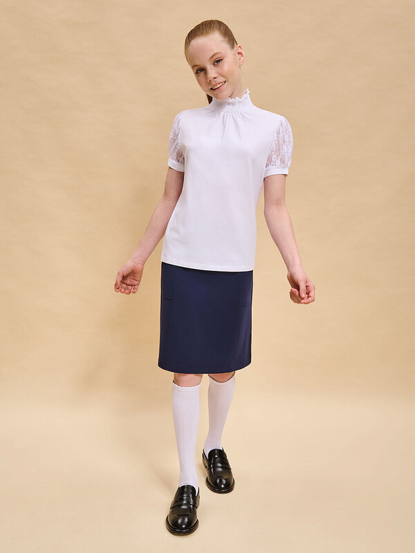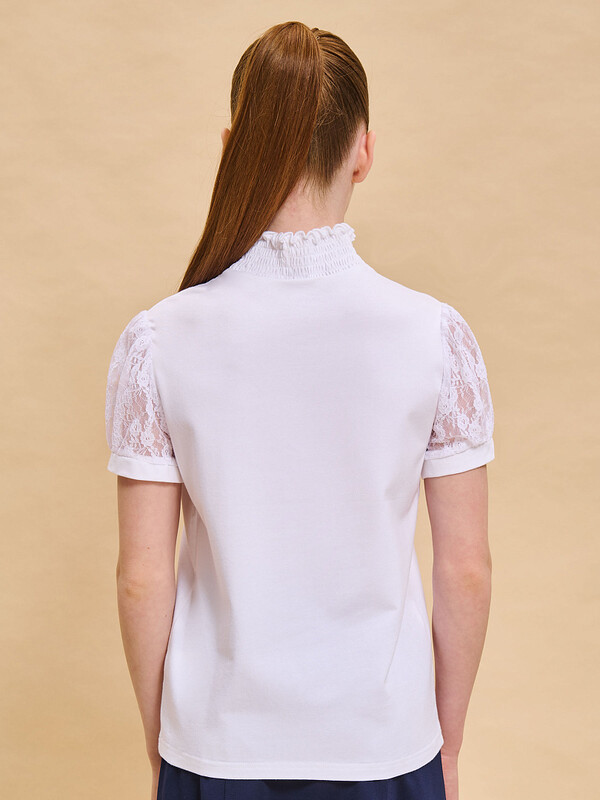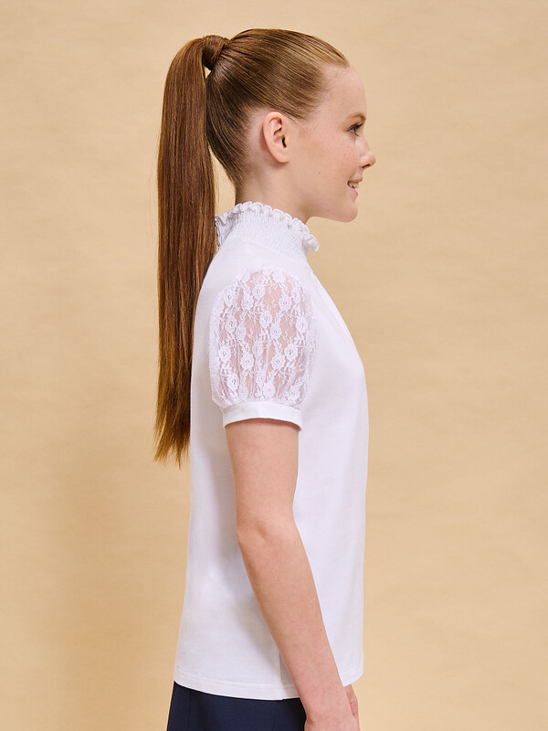 Трикотажная блузка для девочек умеренного объёма, выполнена из эластичного хлопкового материала в комбинации с кружевным полотном. Рукав короткий, из кружевного полотна, с деликатной сборкой по окату и низу. Низ рукава фиксируется узкой манжетой из основного материала. Новым элементом в блузке является воротник-стойка, собранный с помощью нескольких строчек с эластичной шпульной резиной. Спереди по горловине под воротником спроектирована небольшая сборка. Состав: 93%хлопок 7%эластан, вставка: 90%полиамид 10%эластан Комментарии к товару