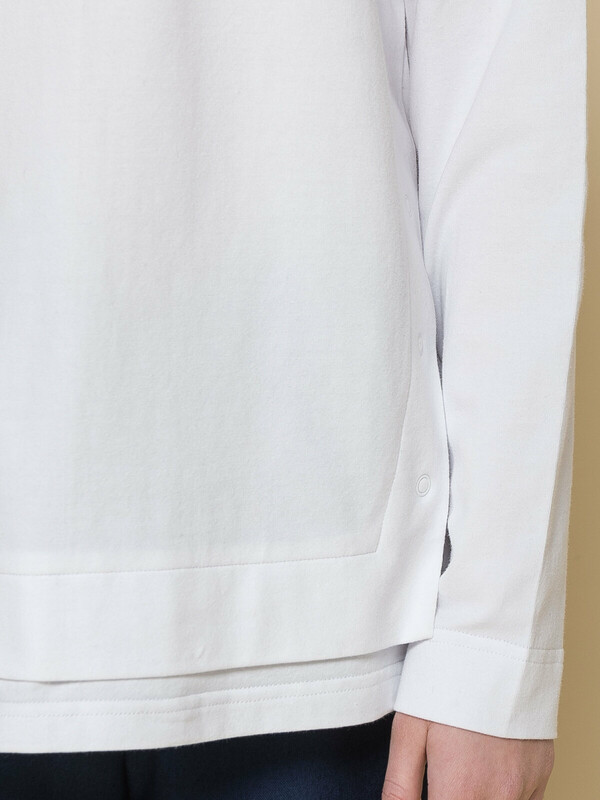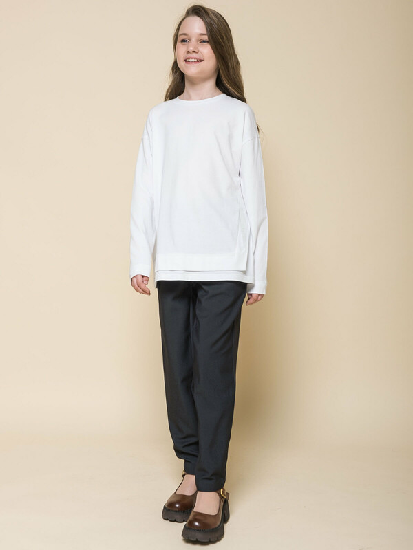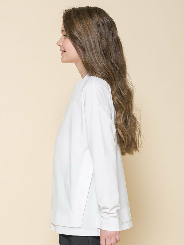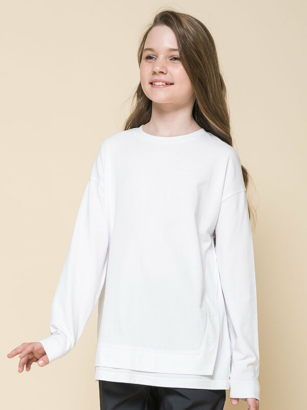 Трикотажный джемпер легкого А-силуэта со спущенным плечом для девочки. В составе ткани преобладает хлопок — модель дышащая, мягкая и приятная на ощупь. Эластан помогает сохранять форму даже после частых стирок. Объемный крой, спущенное плечо – настоящий трендовый оверсайз. В лонгсливе комфортно в течение всего дня, ничего не давит, не колет, не сковывает движения. Рукав книзу заужен — красиво садится по руке. Оригинальный крой создаёт эффект многослойности, двух надетых друг на друга изделий — один из актуальных модных трендов. Изюминка модели — ассиметричный боковой шов, украшенный деликатными кнопками в тон. Такой джемпер можно брать на вырост — благодаря увеличенному объёму он долго не станет малым. Отличный вариант модной школьной формы для девочек.