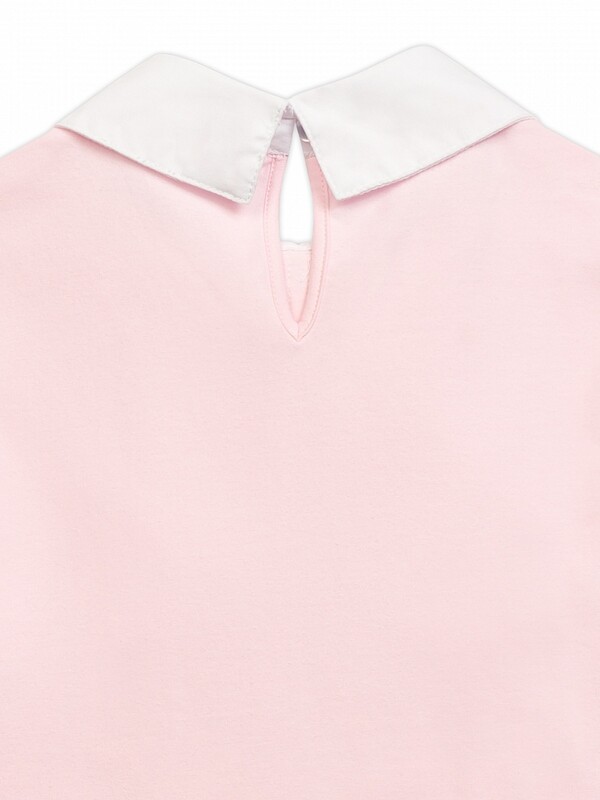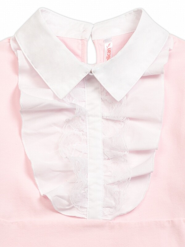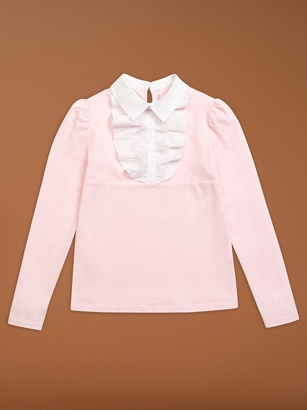 Производитель: Pelican Джемпер для девочек полуприлегающего силуэта с воротником из швейной ткани на отрезной стойке, имитирующим воротник рубашки. Перед украшает жабо из швейной ткани и кружева, собранное под вертикальную планку. Декор в виде брошки с жемчужиной и стразами. По спинке застежка на одну пуговицу. Умеренного объема рукав с небольшой сборкой по окату.