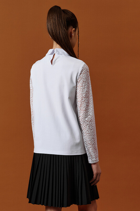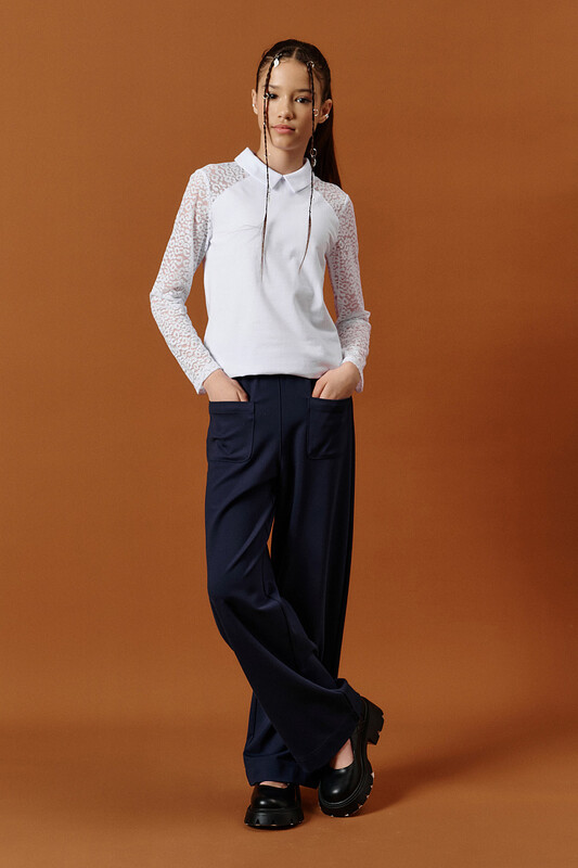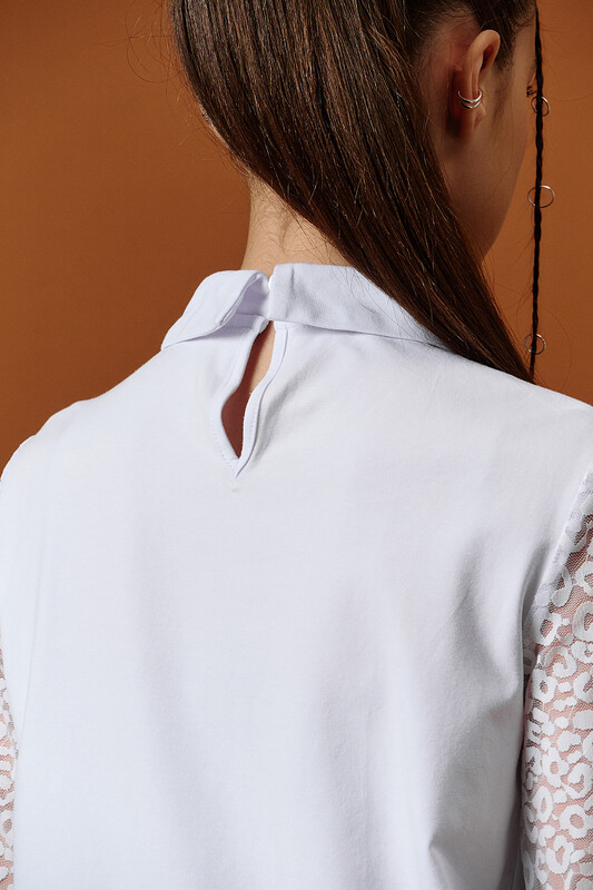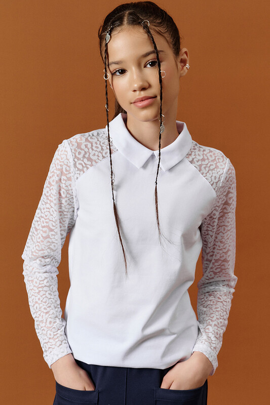 Ищете стильную и удобную блузку для школы, которая сочетает в себе комфорт и элегантность? Эта модель из мягкого эластичного хлопкового трикотажа — отличный выбор для вашей девочки. Наклонные кружевные вставки на плечах и длинные облегающие рукава из нежного эластичного кружева придают блузке изящный и современный вид, при этом кружево мягкое и не раздражает кожу, поэтому ребёнку будет удобно в блузке целый день