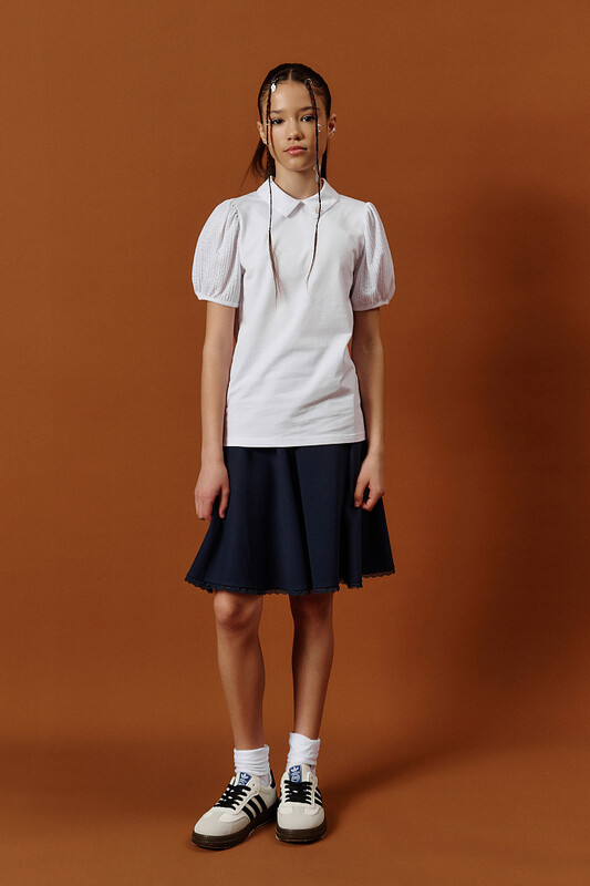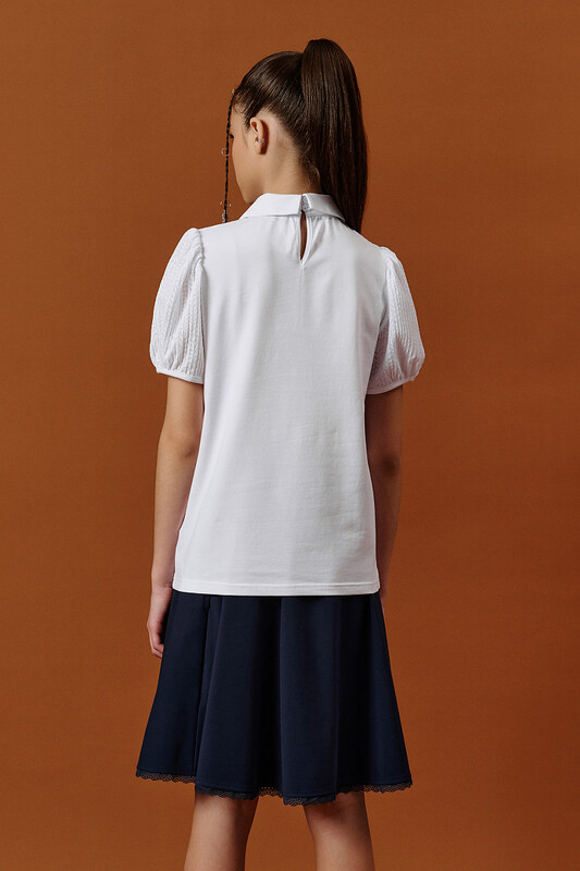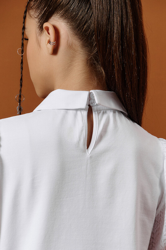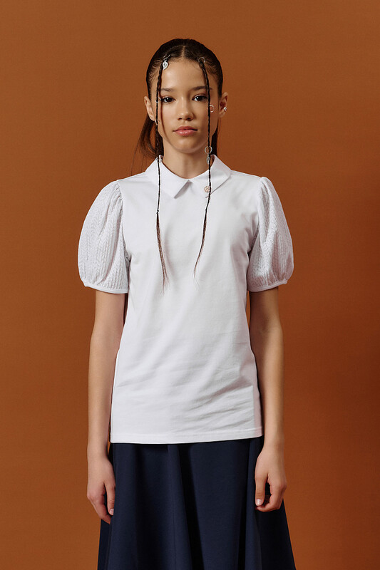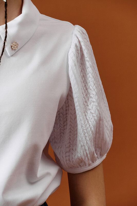 Состав: 93%хлопок 7%эластан, вставка: 83%полиамид 17%эластан Ищете удобную и красивую блузку для школы, которая понравится и маме, и ребёнку? Эта модель — отличный выбор! Блузка изготовлена из мягкого хлопкового трикотажа с добавлением эластана, поэтому она отлично тянется и не сковывает движений — ребёнку будет комфортно в течение всего школьного дня. Короткие рукава из лёгкого гофрированного кружева добавляют лёгкости и нежности образу, а аккуратная сборка по плечам и низу рукавов делает их воздушными и стильными. Воротник создаёт аккуратный и опрятный вид — идеально для школьного дресс-кода. Заботимся о простоте: сзади сделан удобный разрез, чтобы блузку легко надевать через голову, а застёжка на воротнике с двумя пуговицами и мягкими резиновыми петлями позволяет легко ее застегнуть даже ребенку начальных классов. Эта блузка — универсальный выбор для школы, которая прослужит долго благодаря качественным материалам и продуманному дизайну. Она легко сочетается с юбками, брюками и сарафанами, а ещё — благодаря стильному кружеву — смотрится красиво и нарядно, поэтому подходит не только для уроков, но и для школьных праздников и мероприятий. Кроме того, блузка очень проста в уходе — её можно легко стирать и гладить, сохраняя форму и свежий вид даже после многих стирок. Используйте таблицу размеров на фотографии, чтобы выбрать подходящий размер. Обратите внимание, что цвет товара на экране вашего устройства может отличаться от реального. Комментарии к товару