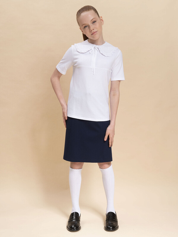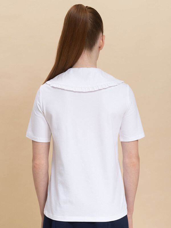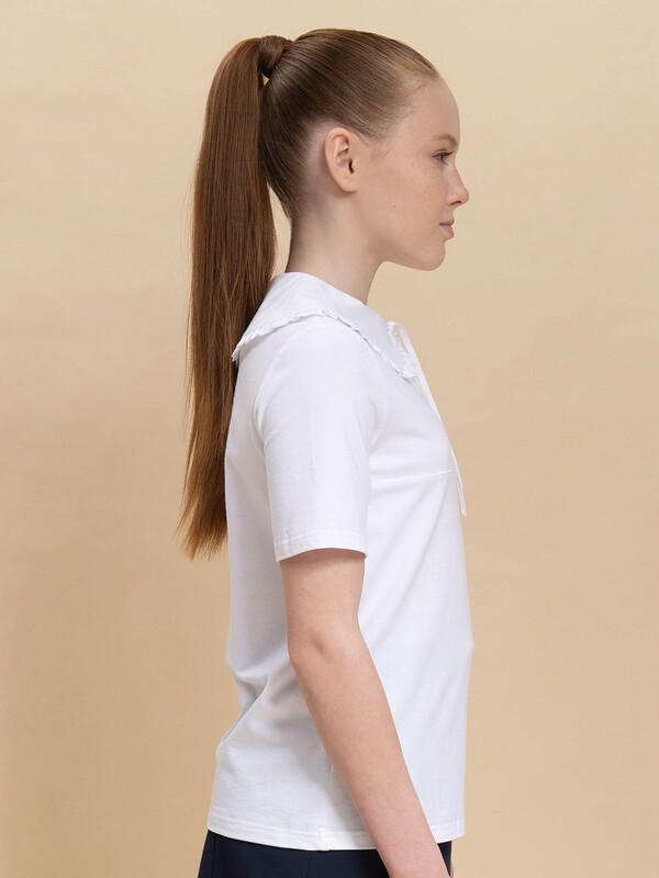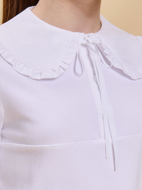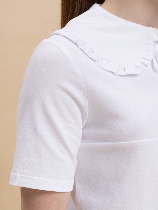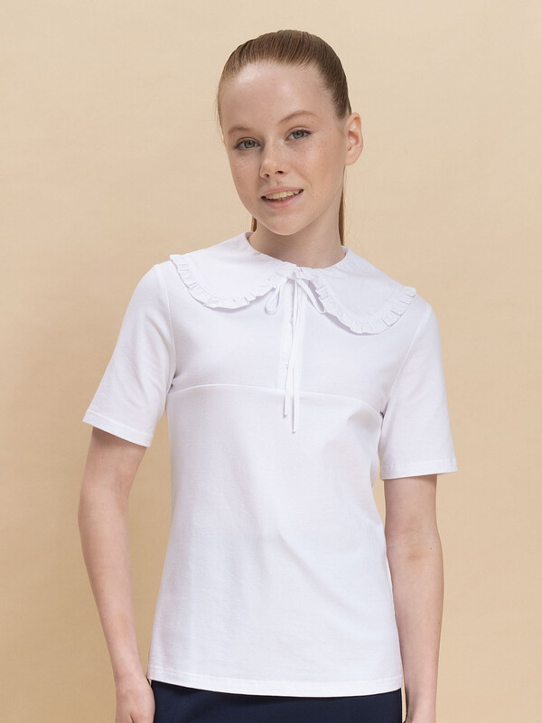 Трикотажная блузка для девочек умеренного объёма, выполнена из эластичного хлопкового материала с коротким рукавом. Новым элементом в блузке является большой плосколежащий воротник фигурной формы, декорированный рюшей по внешнему краю, выполненный из отделочной швейной ткани. Удобство надевания изделия через голову обеспечивается спроектированной спереди планкой из швейного полотна с застежкой на пуговицы. Нижний край планки вшит в кокетку переда. Сзади под воротником пришита узкая декоративная репсовая тесьма, которая завязывается спереди на бантик под воротником. Состав: 93%хлопок 7%эластан, вставка: 60%хлопок 40%полиэстер Комментарии к товару