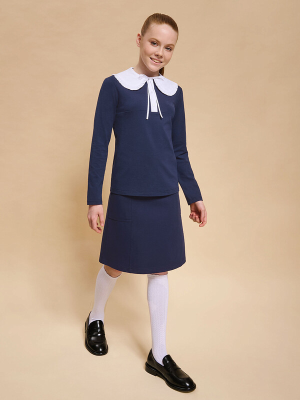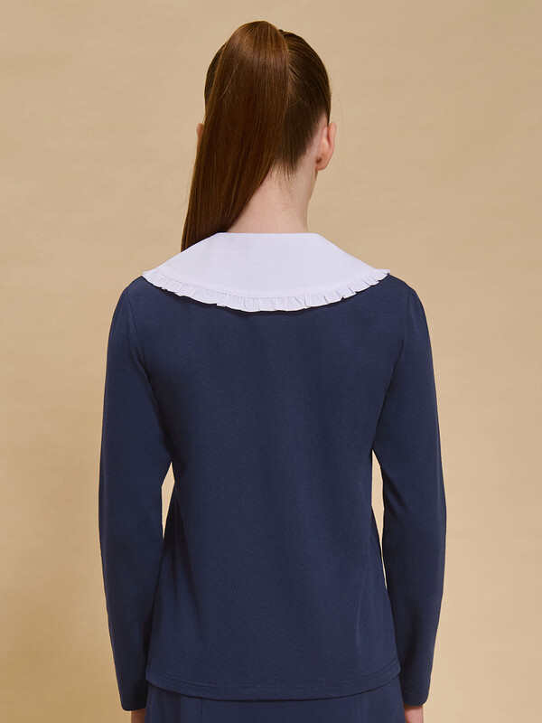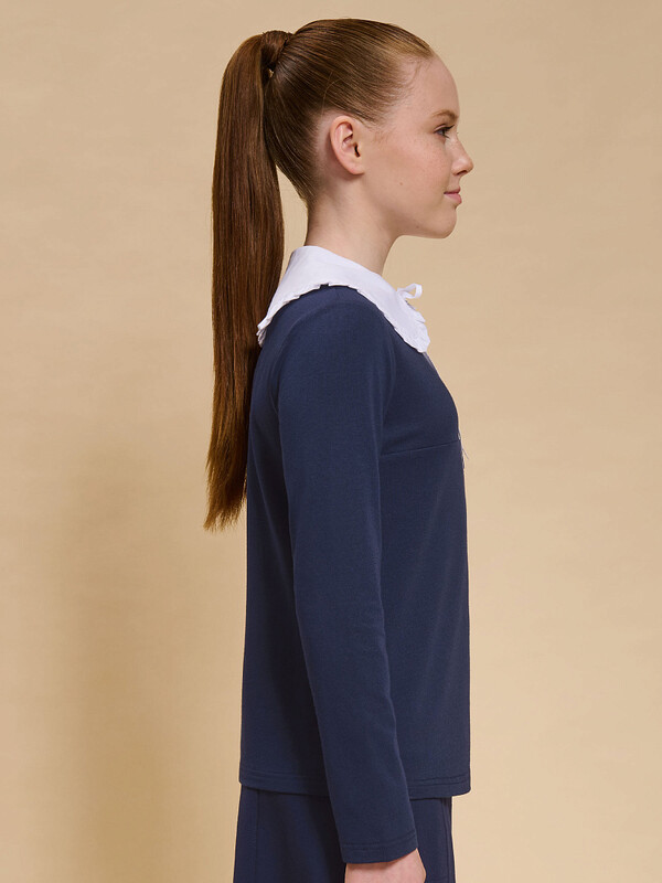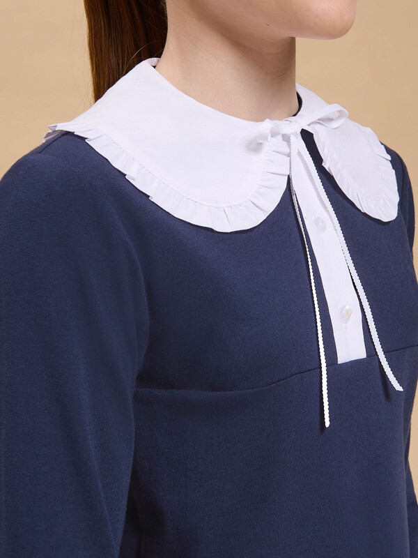 Трикотажная блузка для девочек умеренного объёма, выполнена из эластичного хлопкового материала с длинным рукавом. Новым элементом в блузке является большой плосколежащий воротник фигурной формы, декорированный рюшей по внешнему краю, выполненный из отделочной швейной ткани. Удобство надевания изделия через голову обеспечивается спроектированной спереди планкой из швейного полотна с застежкой на пуговицы. Нижний край планки вшит в кокетку переда. Сзади под воротником пришита узкая декоративная репсовая тесьма, которая завязывается спереди на бантик под воротником.