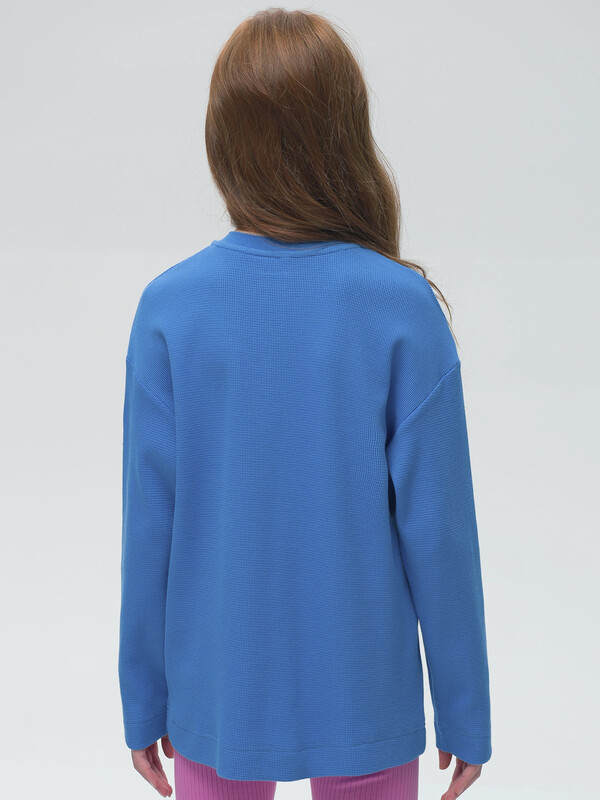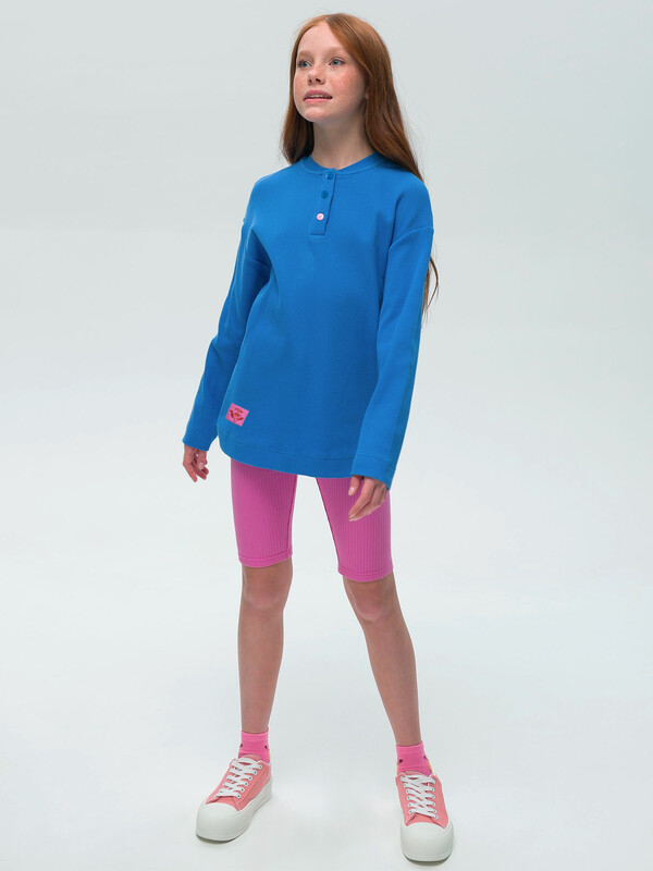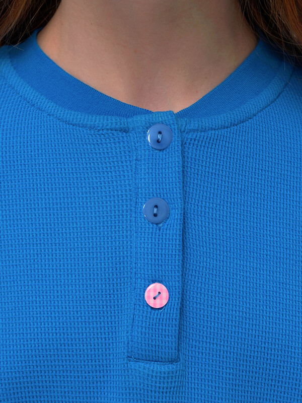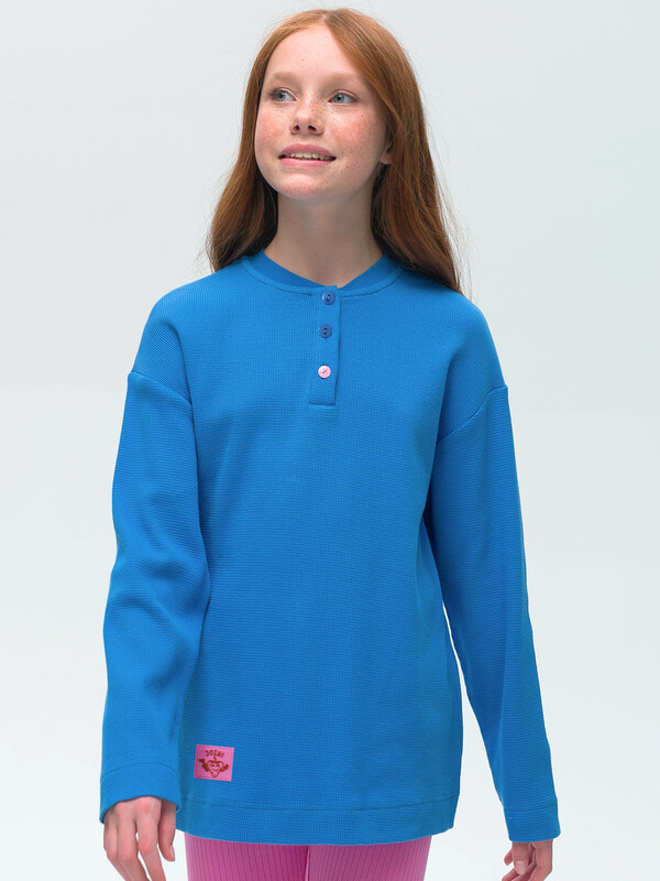 Лонгслив-хенли для девочек. Приятный на ощупь, с большим содержанием хлопка (95%) в составе, гигроскопичный и простой в уходе вафельный трикотаж. Свободный силуэт со спущенным плечом. Воротничок из рибаны – не давит, эластичный. Планка у горловины на пуговицах, нижняя пуговица в розовую клетку – оригинальная фишка модели. Широкая подгибка рукавов и низа – актуальный тренд на увеличенные отделочные детали кроя. Миниатюрная силиконовая нашивка с выпуклыми буквами – тактильно приятная изюминка. Лонгслив подходит на каждый день, для активного образа жизни, идеален для пляжного сезона.