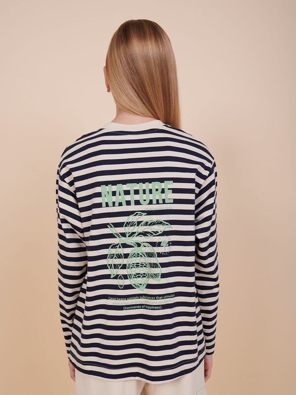 Детский джемпер-поло для девочки. Лонгслив свободного силуэта со спущенным плечом и рубашечными, зауженными книзу рукавами подарит ребёнку комфорт и свободу движения. Вырез горловины и планка с застёжкой на пуговицы обработаны эластичной рибаной (ткань в рубчик) — она отлично держит форму, при этом ребёнку удобно надевать и снимать футболку. Тельняшка — один из супертрендов сезона! За изделием легко ухаживать. Джемпер в полоску (полоска вытканная, не принт) украшено красивым принтом в ботаническом стиле по спинке. На принте изображены какао-бобы. Надписи переводятся: "природа", "шоколадное дерево", "вечнозелёное дерево", "какао-бобы содержат вещества, которые стимулируют выработку эндорфинов и серотонина (гормоны счастья)". Принт мягкий и стойкий, не боится частых стирок. Модель выполнена из 100% высококачественного хлопка — джемпер мягкий и великолепно пропускает воздух, что позволяет коже ребёнка свободно дышать. Изделие представлено в двух актуальных вариантах цвета: тёмно-синем и бордовом. Джемпер идеален для маленьких девочек дошкольного и младшего школьного возраста, а также девочек-подростков. Модель подходит для детского сада, спорта, прогулок, отдыха, а также в качестве домашней одежды. Размерный ряд: 1 (86); 2 (92); 3 (98); 4 (104); 5 (110); 6 (116); 7 (122); 8 (128); 9 (134); 10 (140); 11 (146). Лонгслив детский подходит для носки летом, осенью и весной (демисезон), зимой в качестве среднего слоя одежды. Его просто комбинировать с различными брюками, юбками, сарафанами и джинсами. Детский джемпер поло — замечательный подарок дочери, внучке или сестре на любой праздник. Выбирайте нужный размер по таблице размеров на фото. Цвет товара на экране вашего устройства может отличаться от цвета изделия вживую.