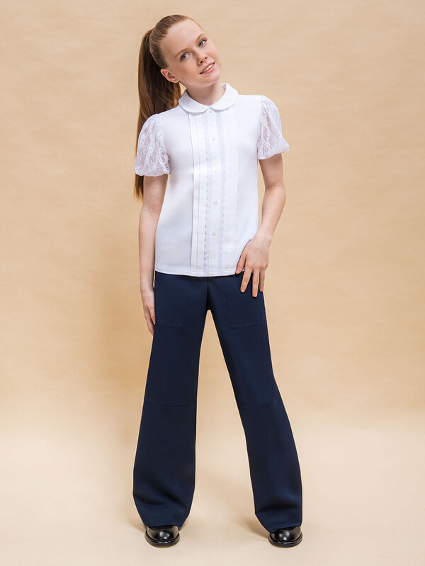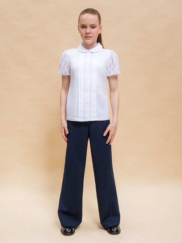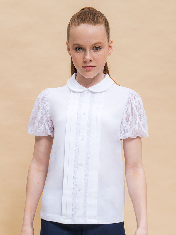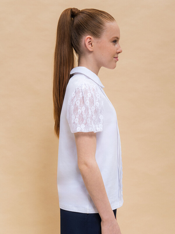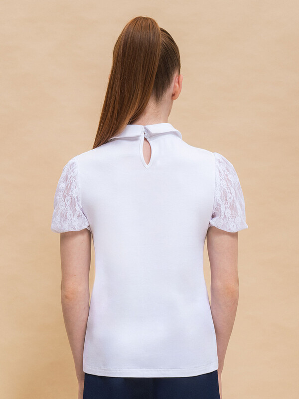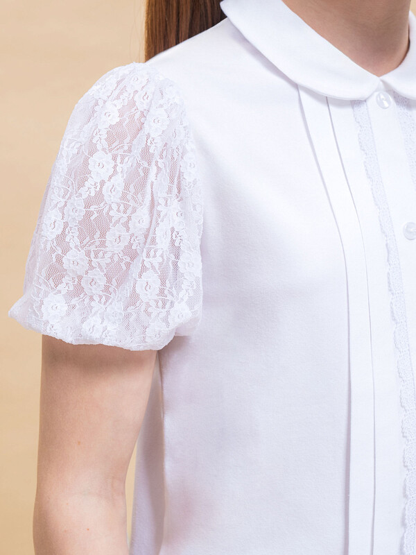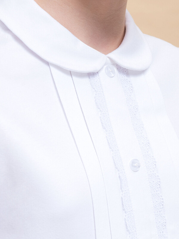 Джемпер из мягкого хлопкового трикотажа с небольшим содержанием эластана, полуприлегающего силуэта, с отложным круглым воротником на цельнокроеной стойке. По центру переда планка с декоративными пуговицами, вдоль которой застрочены вертикальные складки и кружево с фестонным краем. По спинке застежка на две пуговицы. С коротким объёмным рукавом на подкладе из тонкой сетки. По низу рукав присборен на шпульную резину. Состав: 93%хлопок 7%эластан, вставка: 90%полиамид 10%эластан Комментарии к товару