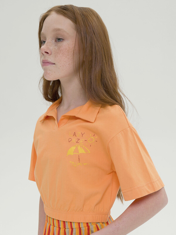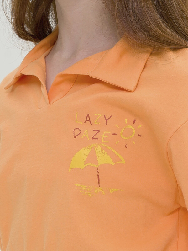 Укороченная футболка-поло для девочки - тренд сезона. Выполнена из хлопкового трикотажа. Не вызывает аллергии и отлично пропускает воздух. Кроп-топ свободного покроя со спущенным плечом и воротником-апаш с расходящейся планкой - для самых модных девочек. Низ изделия присобран на резинку и образует напуск для создания легкого объема. Ненавязчивый принт задаст настроение. Перевод "ленивый день". Отлично сочетается с брюками, юбками и шортами. Дополнит гардероб любой девочки и сделает ее образ стильным и уникальным.