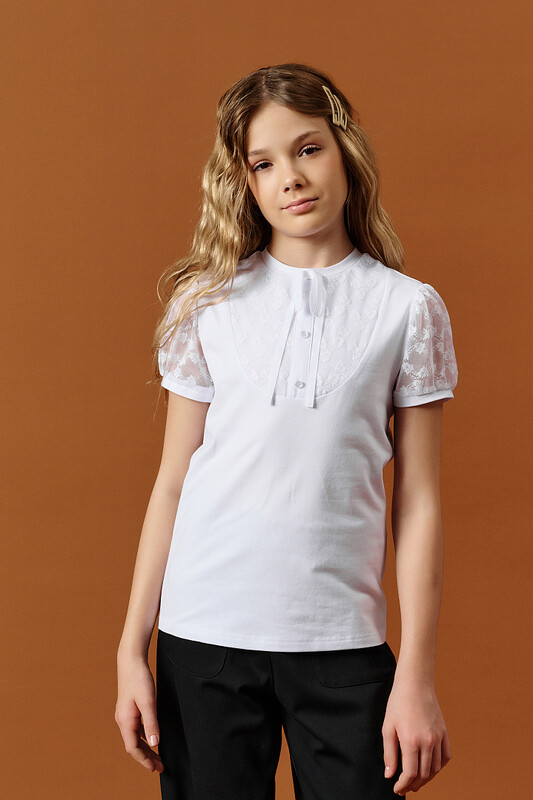 Состав: 93%хлопок 7%эластан, вставка: 90%полиамид 10%эластан Блузка школьная для девочки — нарядная, кружевная, удобная Трикотажная блузка для школы — идеальный выбор для учебных будней и торжественных линеек. Модель выполнена из мягкого эластичного хлопкового трикотажа с кружевными элементами. Ткань приятна к телу, хорошо тянется, не сковывает движений и отлично подходит для длительной носки. Особенности модели: Фигурная кокетка овальной формы в зоне декольте — делает образ аккуратным и нарядным Кокетка двойная: нижний слой — трикотаж, верхний — эластичное кружевное полотно, которое не колется и не раздражает кожу Планка с тремя пуговицами по центру — изящный классический элемент, который подчёркивает стиль школьной формы Кружевные рукава делают образ лёгким и элегантным Уютная горловина с мягкой трикотажной бейкой и бантиком из репсовой ленты — милый акцент, который оценят девочки Преимущества: ✔ Отлично подходит как школьная форма для девочек ✔ Стильная и нарядная блузка для праздников, линеек, концертов ✔ Комфортна даже при длительной носке — мягкий материал и удобный крой ✔ Легко стирается, не теряет форму и цвет ✔ Универсальна: сочетается с юбками, брюками, сарафанами Используйте таблицу размеров на фотографии, чтобы выбрать подходящий размер. Обратите внимание, что цвет товара на экране вашего устройства может отличаться от реального. Комментарии к товару