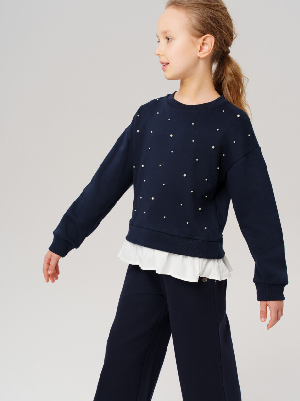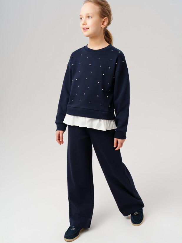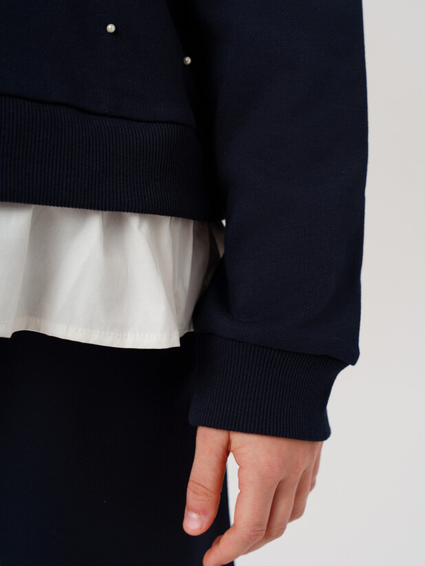 Посадка прямого силуэта делает такой классический школьный джемпер для подростков универсальным для создания как строгого, так и повседневного образа. Белая текстильная вставка и декор из бусин добавляют индивидуальности — такой детский трикотажный джемпер будет уместен и на уроках, и на школьных мероприятиях.