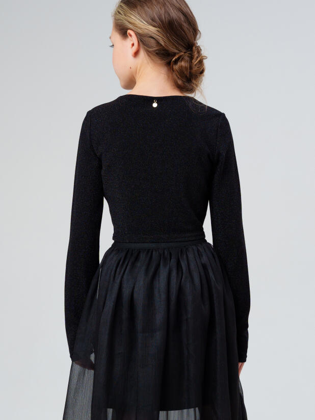 Надевая его, вы создаете роскошный образ, идеально подходящий для для фотосессий и других особых случаев. Благодаря плотному теплому трикотажу с люрексом его можно носить осенью или зимой.