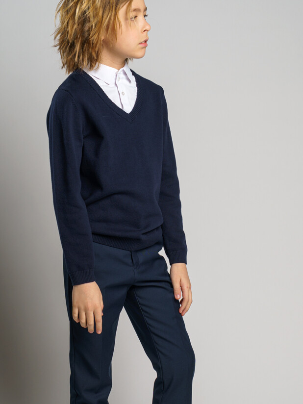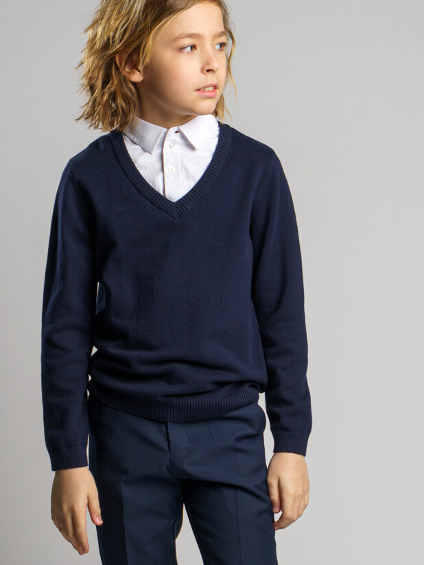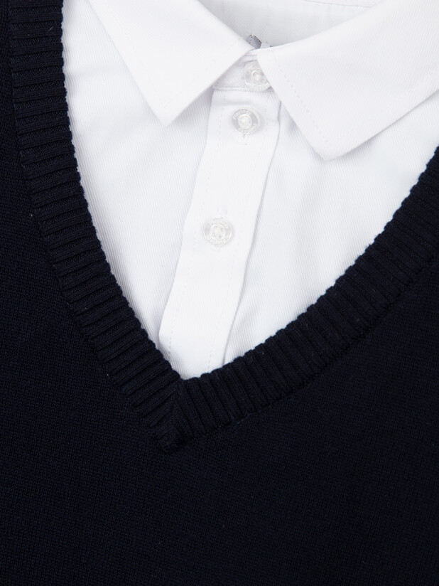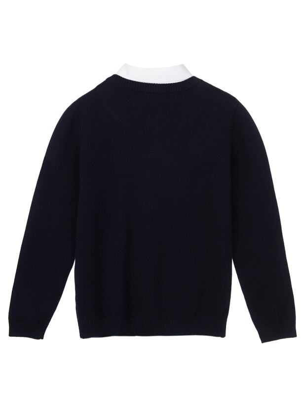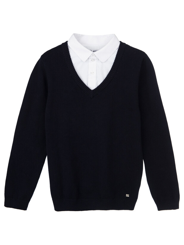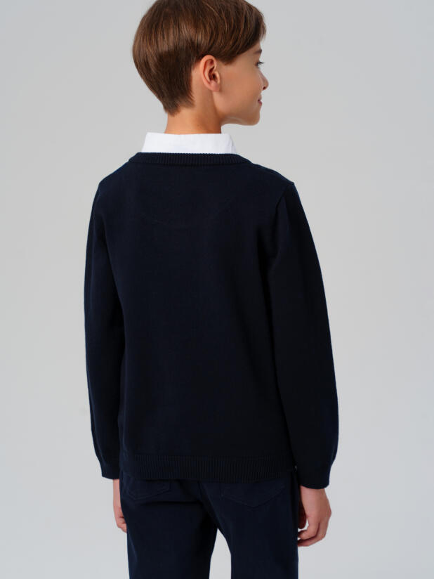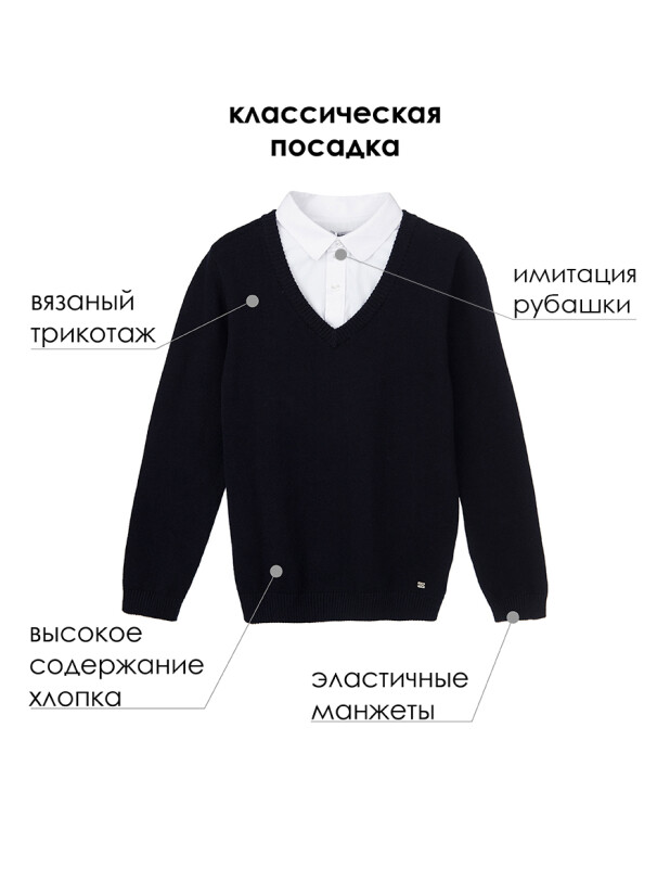 Этот классический подростковый джемпер для мальчиков объединяет в себе тепло трикотажа и строгий вид классической белой школьной рубашки. Благодаря встроенному текстильному элементу в зоне воротника и планки, создаётся эффект многослойности — как будто под этой стильной школьной кофтой для подростков надета аккуратная классическая сорочка для мальчика, но при этом ничего не мешает движению и не натирает.