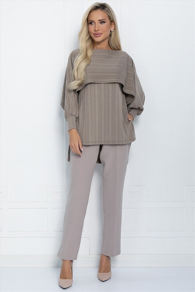 Комфортный джемпер свободного кроя - повседневный элемент женской одежды. Модель оригинальная, с имитацией двойной кофты. Горловина округлая, рукав спущенный. Модель достаточно свободная, легкий оверсайз, отлично садится на любую фигуру, скрывая все недостатки. Также подойдет для будущих мам.