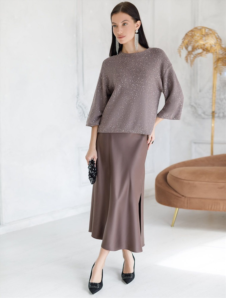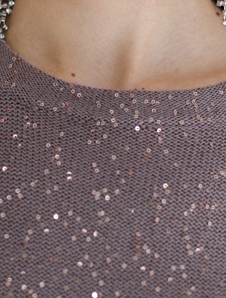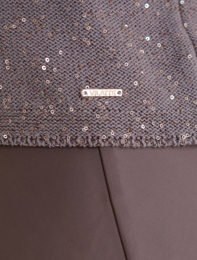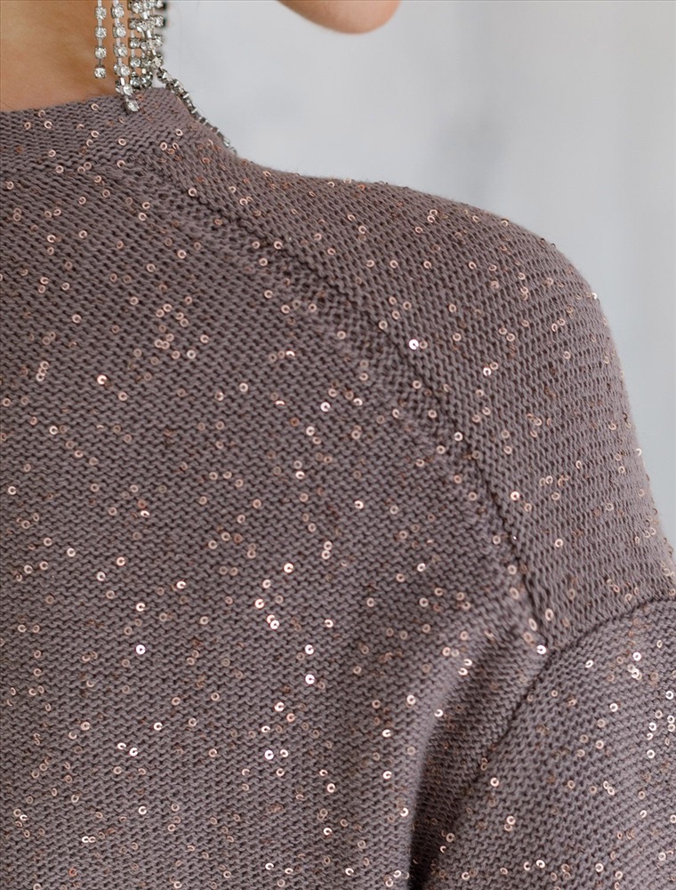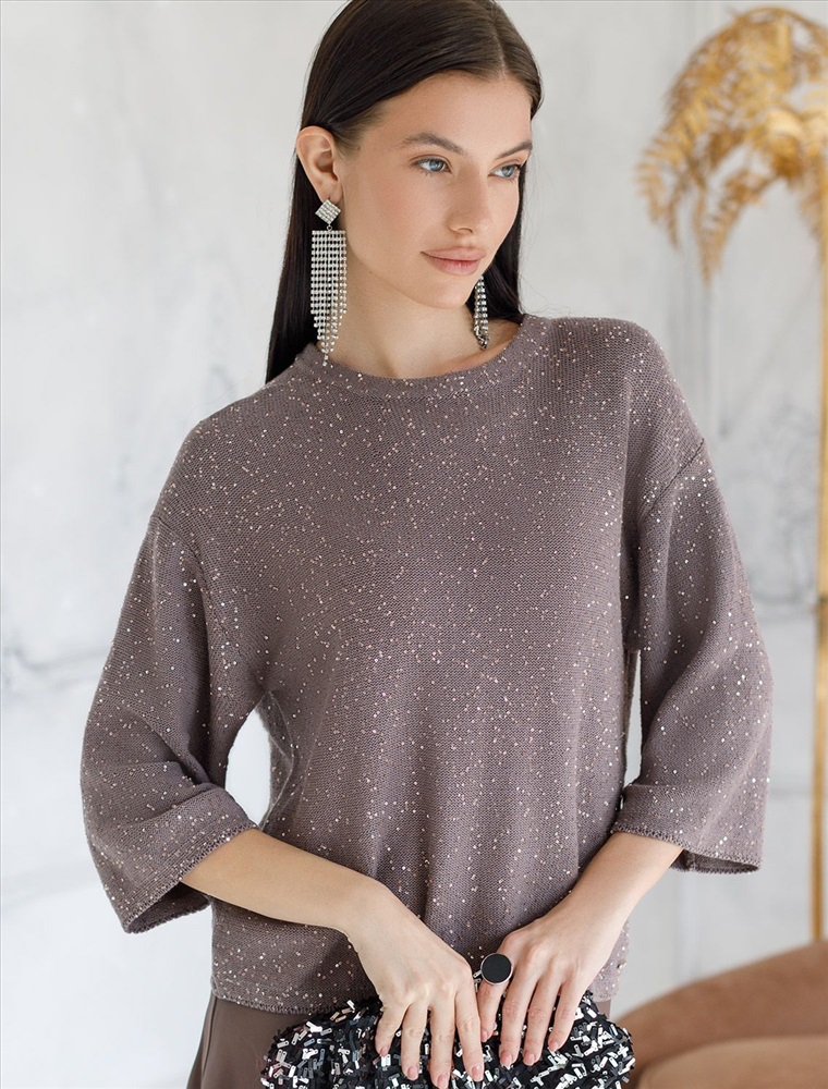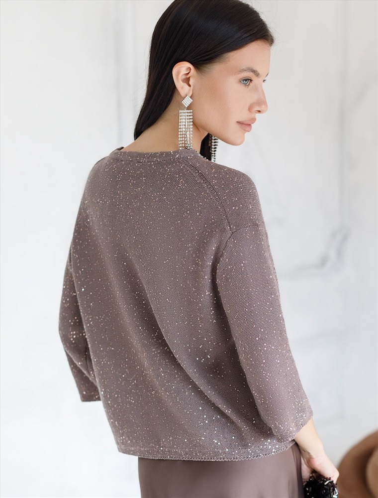 Легкий джемпер кофейного цвета с рукавом три четверти выполнен из хлопковой пряжи с вкраплением сияющих пайеток, что придает особую изысканность. Стильный джемпер связан изнанкой, пряжа отличается легкостью и приятной текстурой, совершенно не колется, обеспечивает комфорт даже при длительном использовании, а натуральные волокна поддерживают оптимальный температурный баланс. Крой полуприлегающий, подчеркивает женственный силуэт, а круглый ворот и спущенная линия плеча гармонично завершают дизайн, создающий аккуратный образ. Нарядный джемпер подойдет девушкам и женщинам больших размеров, в нем вы будете чувствовать себя уверенно и свободно в любой ситуации. Мерцающий эффект пайеток добавляет образу выразительности и индивудуальности. Сочетайте джемпер в романтическом образе с пышной юбкой, в более строгом с широкими брюками. Мерцающее полотно добавляет особого шарма вашему образу, делая его уместным как на праздник, так и для повседневного выхода. Новый год, вечеринка или любое другое мероприятие пройдут ярко — сияющие пайетки создают ощущение праздника в каждом движении.