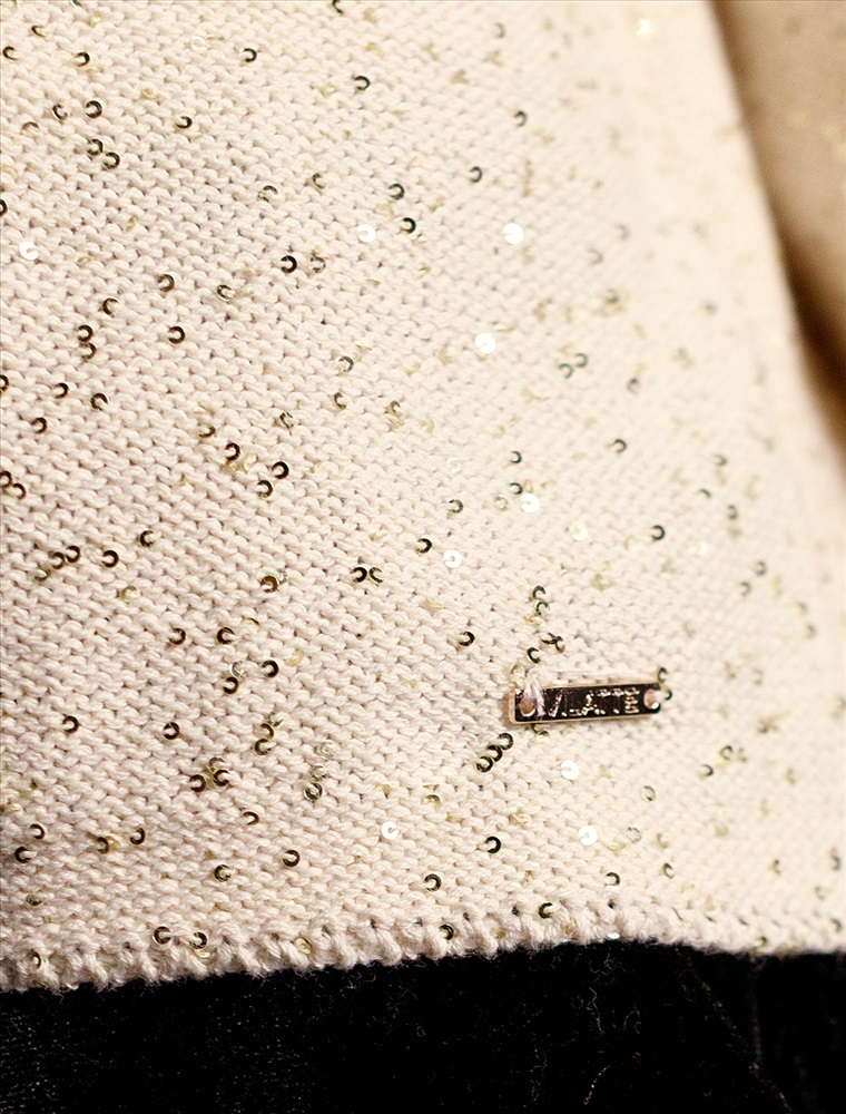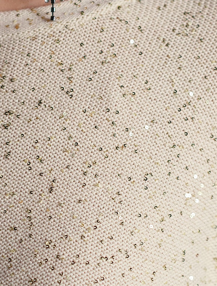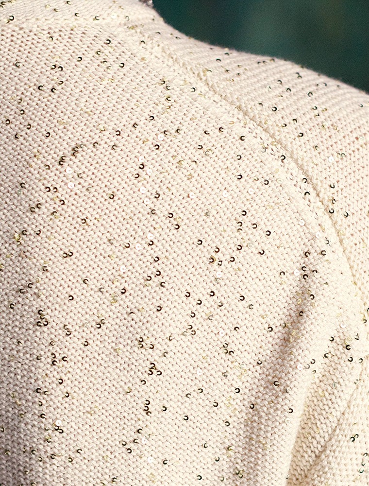 Легкий джемпер бежевого цвета с рукавом три четверти выполнен из хлопковой пряжи с вкраплением сияющих пайеток, что придает особую изысканность. Стильный джемпер связан изнанкой, пряжа отличается легкостью и приятной текстурой, совершенно не колется, обеспечивает комфорт даже при длительном использовании, а натуральные волокна поддерживают оптимальный температурный баланс. Крой полуприлегающий, подчеркивает женственный силуэт, а круглый ворот и спущенная линия плеча гармонично завершают дизайн, создающий аккуратный образ. Нарядный джемпер подойдет девушкам и женщинам больших размеров, в нем вы будете чувствовать себя уверенно и свободно в любой ситуации. Мерцающий эффект пайеток добавляет образу выразительности и индивудуальности. Сочетайте джемпер в романтическом образе с пышной юбкой, в более строгом с широкими брюками. Мерцающее полотно добавляет особого шарма вашему образу, делая его уместным как на праздник, так и для повседневного выхода. Новый год, вечеринка или любое другое мероприятие пройдут ярко — сияющие пайетки создают ощущение праздника в каждом движении.