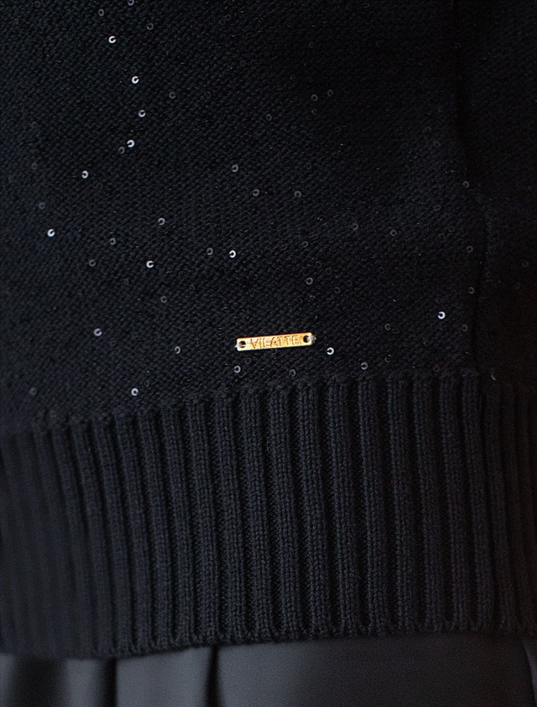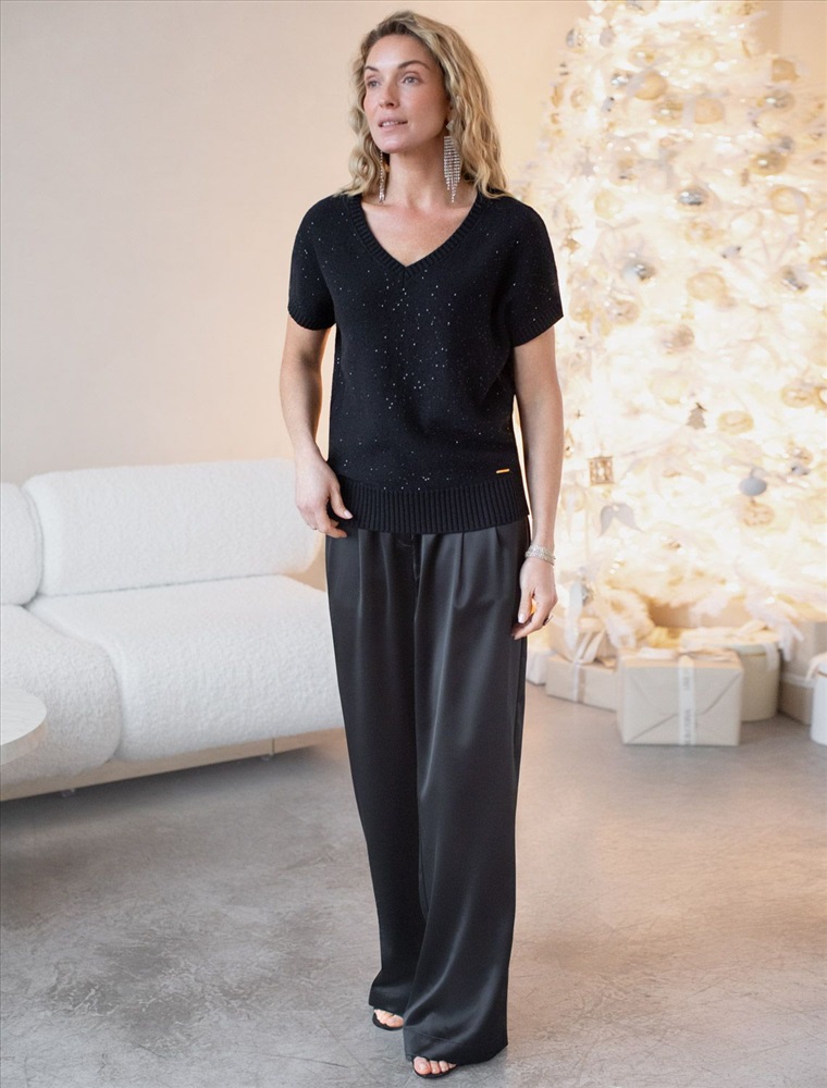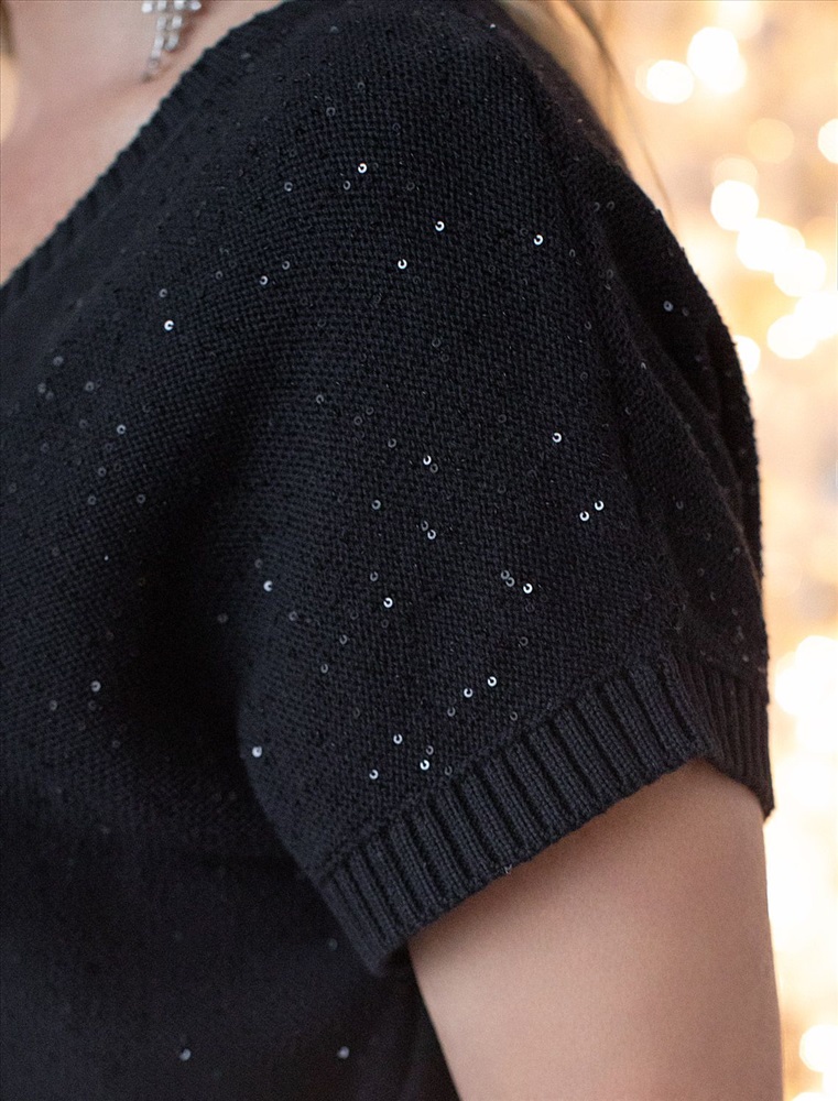 Легкий джемпер черного цвета с V вырезом и коротким рукавом выполнен из хлопковой пряжи с вкраплением сияющих пайеток, что придает особую изысканность. Нарядный джемпер связан изнанкой, пряжа отличается легкостью и приятной текстурой, совершенно не колется, обеспечивает комфорт даже при длительном использовании, а натуральные волокна поддерживают оптимальный температурный баланс. Свободный крой с эластичной манжетой по низу и цельнокроенный рукав создают расслабленый, но аккуратный образ. Умеренно открытое декольте вытягивает шею и подчеркивает ее изящество. Стильный джемпер подойдет девушкам и женщинам больших размеров, в нем вы будете чувствовать себя уверенно и свободно в любой ситуации. Блестящий эффект пайеток добавляет образу выразительности и индивидуальности. Мерцающее полотно добавляет особого шарма вашему образу, делая его уместным как на праздник, так и для повседневного выхода. Новый год, вечеринка или любое другое мероприятие пройдут ярко — сияющие пайетки создают ощущение праздника в каждом движении. Для спокойного повседневного аутфита добавьте к этому эффектному джемперу спокойный низ, близкий по цвету, без дополнительных элементов декора.