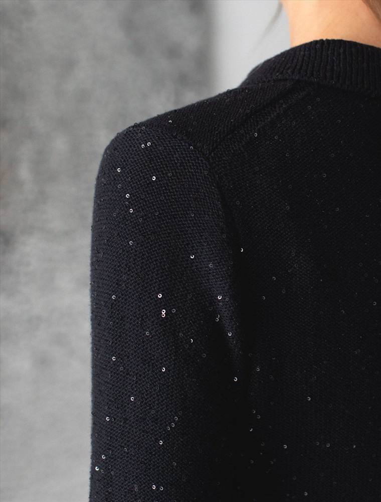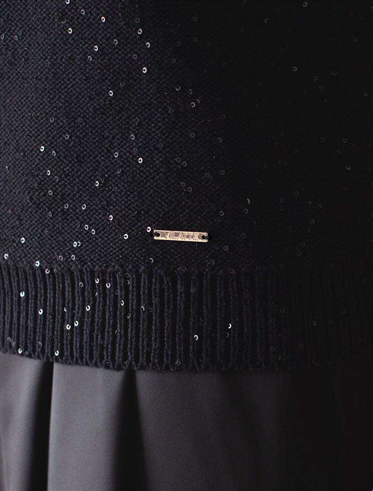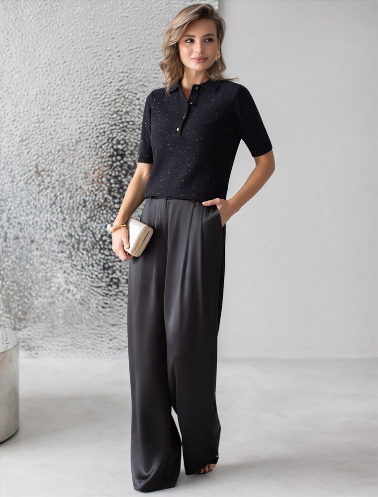 Легкий джемпер поло черного цвета с коротким рукавом выполнен из хлопковой пряжи с вкраплением сияющих пайеток, что придает особую изысканность. Стильный джемпер связан изнанкой, пряжа отличается легкостью и приятной текстурой, совершенно не колется, обеспечивает комфорт даже при длительном использовании, а натуральные волокна поддерживают оптимальный температурный баланс. Крой полуприлегающий, подчеркивает женственный силуэт, а отложной воротничок с застежкой на золотистые пуговицы и манжеты на рукавах гармонично завершают дизайн, создающий аккуратный образ. Нарядный джемпер подойдет девушкам и женщинам больших размеров, в нем вы будете чувствовать себя уверенно и свободно в любой ситуации. Мерцающий эффект пайеток добавляет образу выразительности и индивудуальности. Сочетайте джемпер в романтическом образе с пышной юбкой, в более строгом с широкими брюками. С этим поло легко создать премиальный лук в стиле old money. Мерцающее полотно добавляет особого шарма вашему образу, делая его уместным как на праздник, так и для повседневного выхода. Новый год, вечеринка или любое другое мероприятие пройдут ярко — сияющие пайетки создают ощущение праздника в каждом движении.