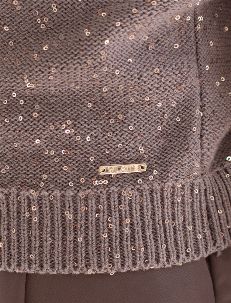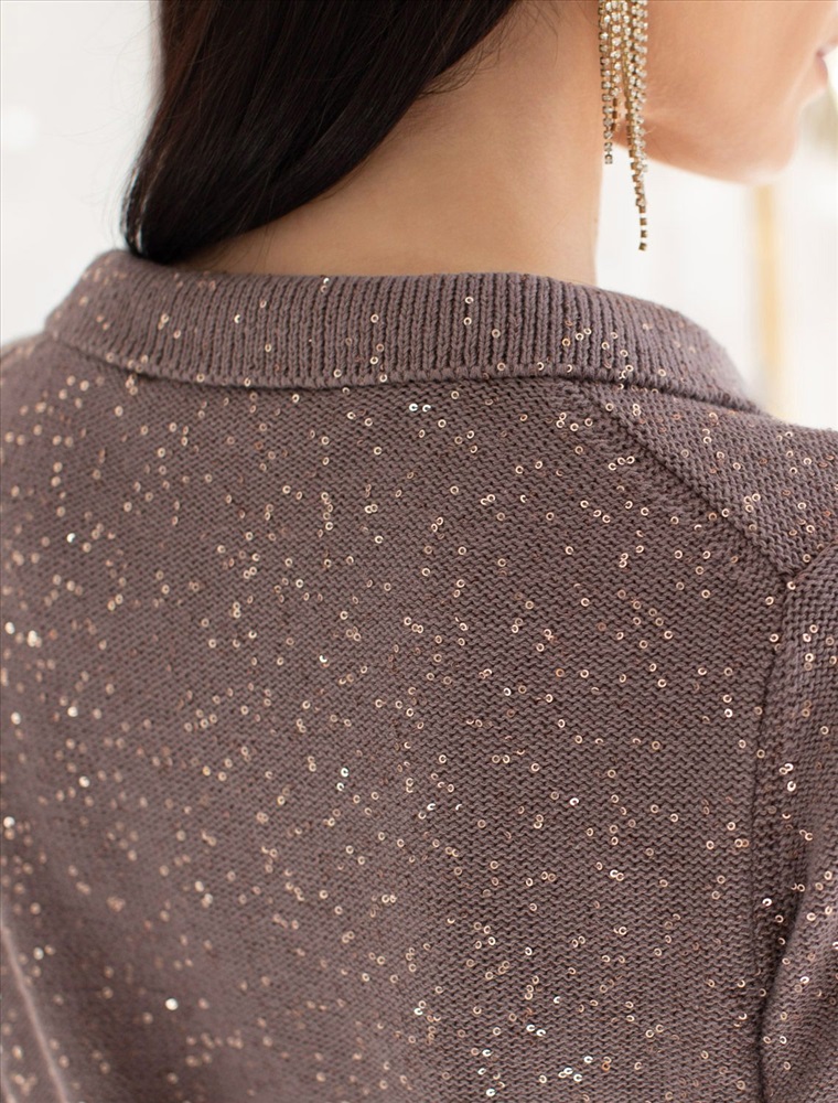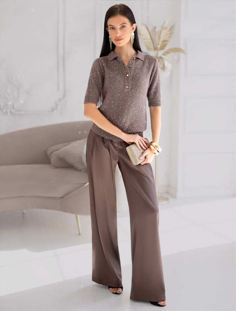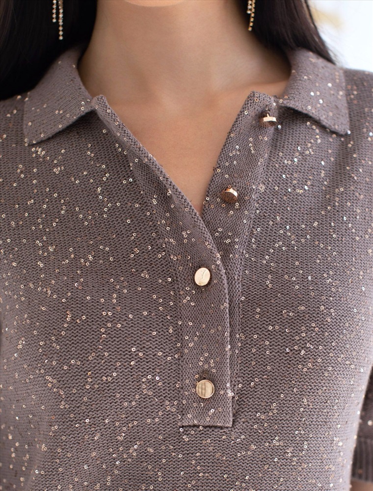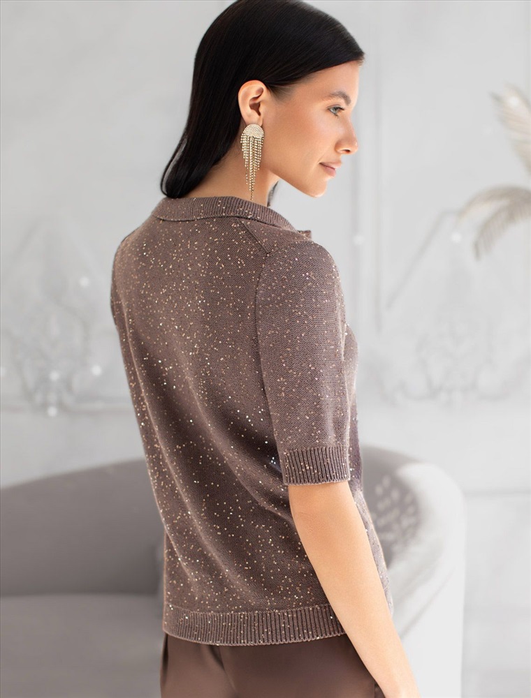 Легкий джемпер поло кофейного цвета с коротким рукавом выполнен из хлопковой пряжи с вкраплением сияющих пайеток, что придает особую изысканность. Стильный джемпер связан изнанкой, пряжа отличается легкостью и приятной текстурой, совершенно не колется, обеспечивает комфорт даже при длительном использовании, а натуральные волокна поддерживают оптимальный температурный баланс. Крой полуприлегающий, подчеркивает женственный силуэт, а отложной воротничок с застежкой на золотистые пуговицы и манжеты на рукавах гармонично завершают дизайн, создающий аккуратный образ. Нарядный джемпер подойдет девушкам и женщинам больших размеров, в нем вы будете чувствовать себя уверенно и свободно в любой ситуации. Мерцающий эффект пайеток добавляет образу выразительности и индивудуальности. Сочетайте джемпер в романтическом образе с пышной юбкой, в более строгом с широкими брюками. С этим поло легко создать премиальный лук в стиле old money. Мерцающее полотно добавляет особого шарма вашему образу, делая его уместным как на праздник, так и для повседневного выхода. Новый год, вечеринка или любое другое мероприятие пройдут ярко — сияющие пайетки создают ощущение праздника в каждом движении.