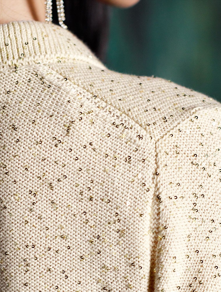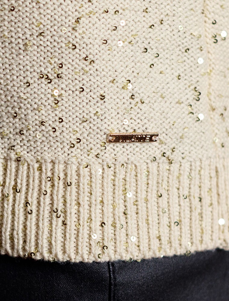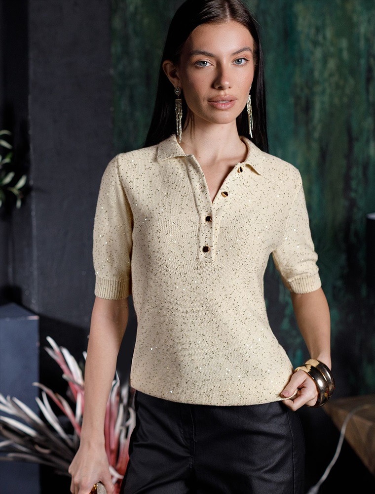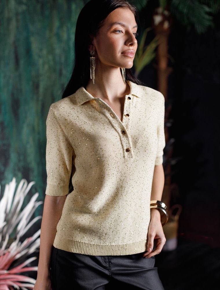 Легкий джемпер поло бежевого цвета с коротким рукавом выполнен из хлопковой пряжи с вкраплением сияющих пайеток, что придает особую изысканность. Стильный джемпер связан изнанкой, пряжа отличается легкостью и приятной текстурой, совершенно не колется, обеспечивает комфорт даже при длительном использовании, а натуральные волокна поддерживают оптимальный температурный баланс. Крой полуприлегающий, подчеркивает женственный силуэт, а отложной воротничок с застежкой на золотистые пуговицы и манжеты на рукавах гармонично завершают дизайн, создающий аккуратный образ. Нарядный джемпер подойдет девушкам и женщинам больших размеров, в нем вы будете чувствовать себя уверенно и свободно в любой ситуации. Мерцающий эффект пайеток добавляет образу выразительности и индивудуальности. Сочетайте джемпер в романтическом образе с пышной юбкой, в более строгом с широкими брюками. С этим поло легко создать премиальный лук в стиле old money. Мерцающее полотно добавляет особого шарма вашему образу, делая его уместным как на праздник, так и для повседневного выхода. Новый год, вечеринка или любое другое мероприятие пройдут ярко — сияющие пайетки создают ощущение праздника в каждом движении.