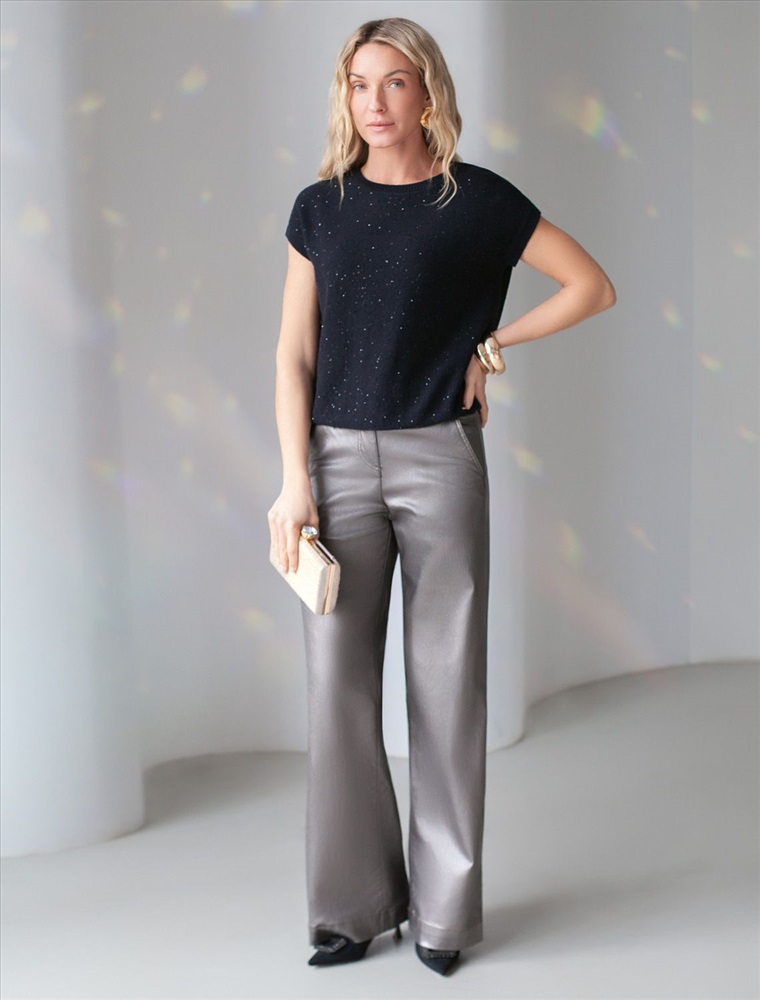 Легкий джемпер черного цвета с цельнокроеным коротким рукавом выполнен из хлопковой пряжи с вкраплением сияющих пайеток, что придает особую изысканность. Стильный джемпер связан изнанкой, пряжа отличается легкостью и приятной текстурой, совершенно не колется, обеспечивает комфорт даже при длительном использовании, а натуральные волокна поддерживают оптимальный температурный баланс. Свободный крой с эластичной манжетой по низу и цельнокроенный рукав создают расслабленный, но аккуратный образ. Нарядный джемпер подойдет девушкам и женщинам больших размеров, в нем вы будете чувствовать себя уверенно и свободно в любой ситуации. Мерцающий эффект пайеток добавляет образу выразительности и индивудуальности. Мерцающее полотно добавляет особого шарма вашему образу, делая его уместным как на праздник, так и для повседневного выхода. Новый год, вечеринка или любое другое мероприятие пройдут ярко — сияющие пайетки создают ощущение праздника в каждом движении. Для спокойного повседневного аутфита добавьте к этому эффектному джемперу спокойный низ, близкий по цвету, без дополнительных элементов декора.