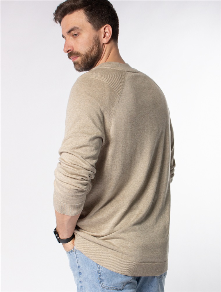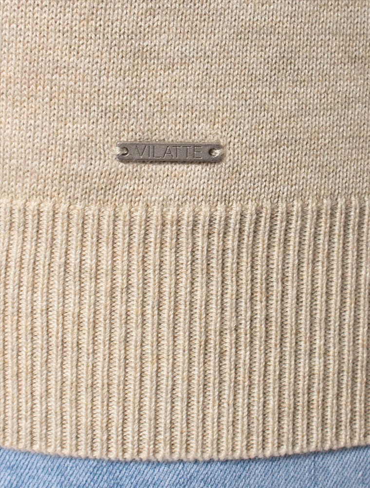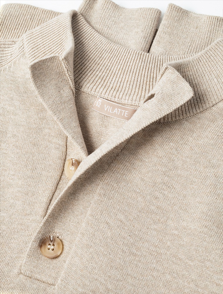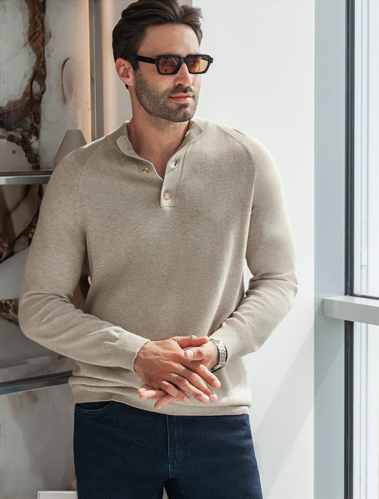 Параметры модели на первом фото: Рост 190, бюст 108, талия 87, бедра 104 Светло-бежевый джемпер меланж с воротом, застегивающимся на черепаховые пуговицы, связали из мягкого хлопка с добавлением акрила; состав, который отлично согревает, не колется и при этом не перегревает тело, поэтому вещь получилась максимально комфортной для переменчивой погоды. Повседневный образ поддержат черные брюки, синие джинсы и броги. Комментарии к товару