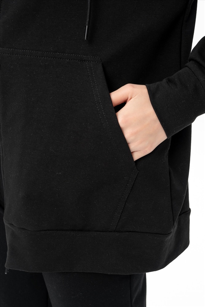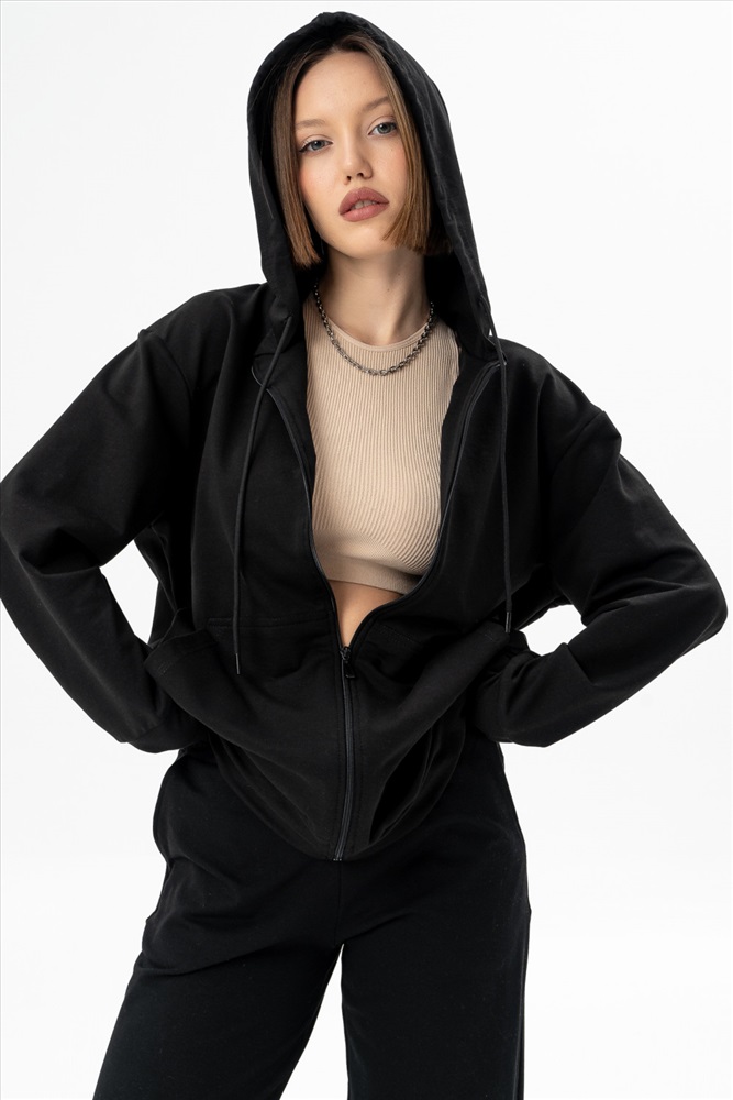 Куртка из мягкого хлопкового футера имеет капюшон на шнурке, карманы и манжеты на рукавах, благодаря чему модель смотрится стильно и модно. Рукава объемные со спущенным плечом. Идеальный вариант для тех, кто любит изделия с молнией.