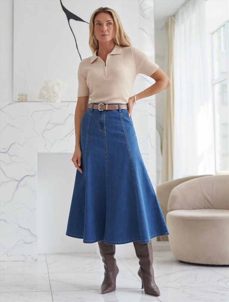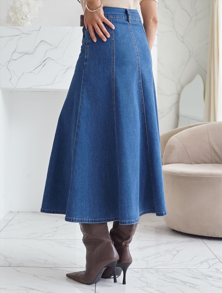Эффектная юбка миди А силуэта выполнена из эластичного денима, что обеспечивает комфорт и легкость движений на каждый день. Невероятно женственная юбка глубокого синего цвета с декоративными плоскими швами по всей длине визуально вытягивает фигуру, два боковых шва расположены под наклоном, что еще больше стройнит силуэт и подчеркивает бедра, создавая гармоничный силуэт. Декоративные швы придают особый акцент образу, делая его современным и стильным. Благодаря универсальному фасону расклешенная юбка подходит для худеньких девушек. Эластичная ткань легко адаптируется под особенности фигуры, не стесняет движений и держит форму в течение длительной носки, натуральный материал отличается высокой износостойкостью и обеспечивает отличную воздухопроницаемость