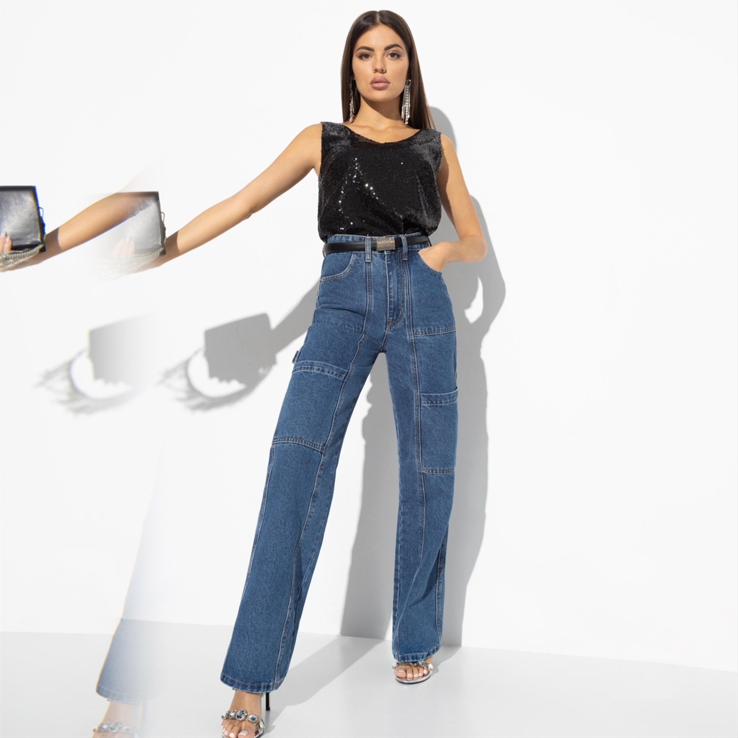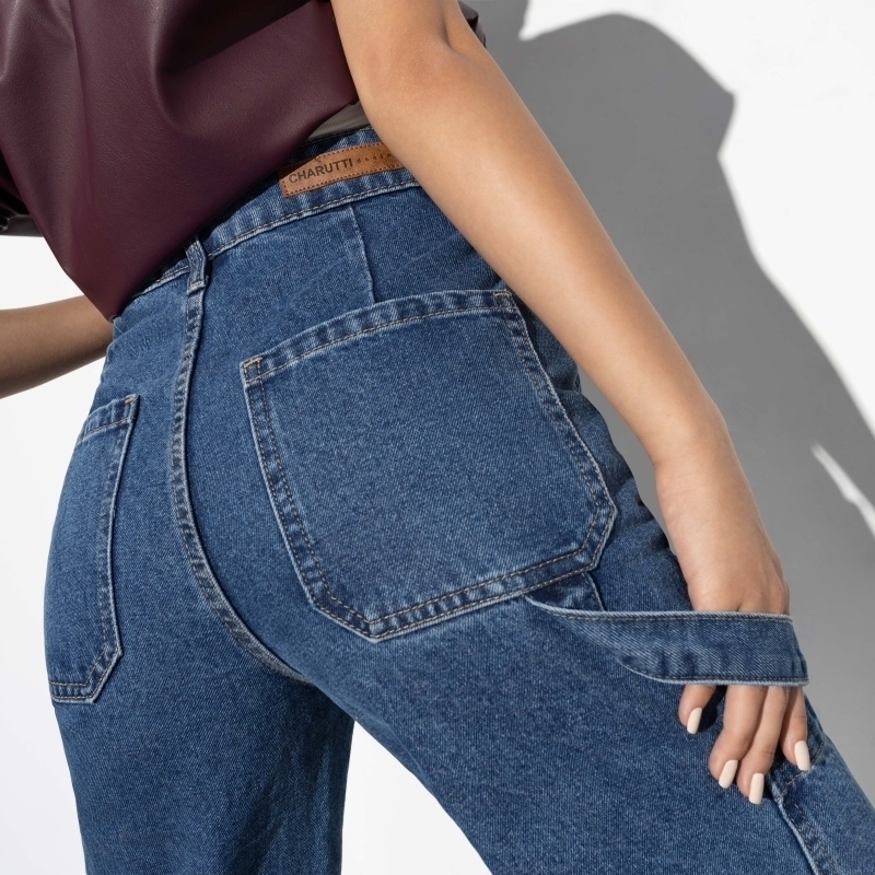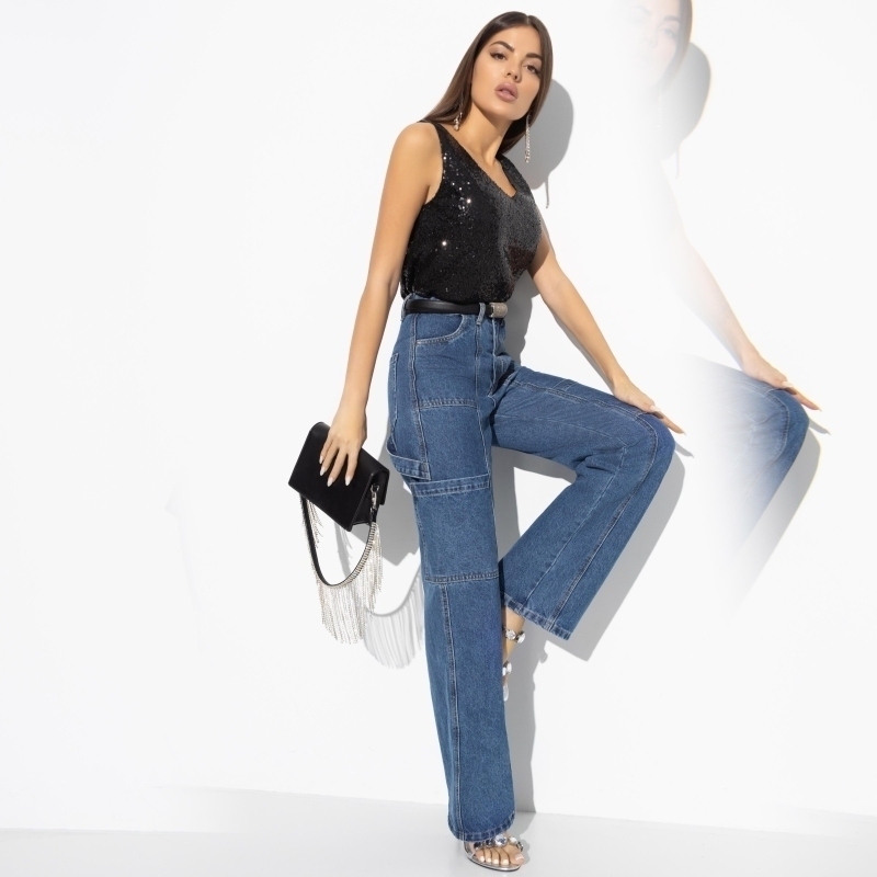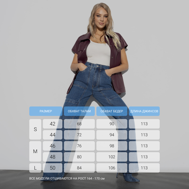 ТН ВЭД: 6204623100; Состав: «Джинса» (100% хлопок); Плотность ткани: Плотная; Тип ткани: Текстиль; Вид застежки: Пуговица/-ы, молния; Карманы: Накладные; Основной цвет ткани: Синий; Отрезная талия: Есть; Подклад: Нет; Резинка по талии: Нет; Рисунок/раппорт: Нет, все изделия идентичны; Силуэт: Прилегающий; Стиль: Повседневный; Фасон брюк: Клеш