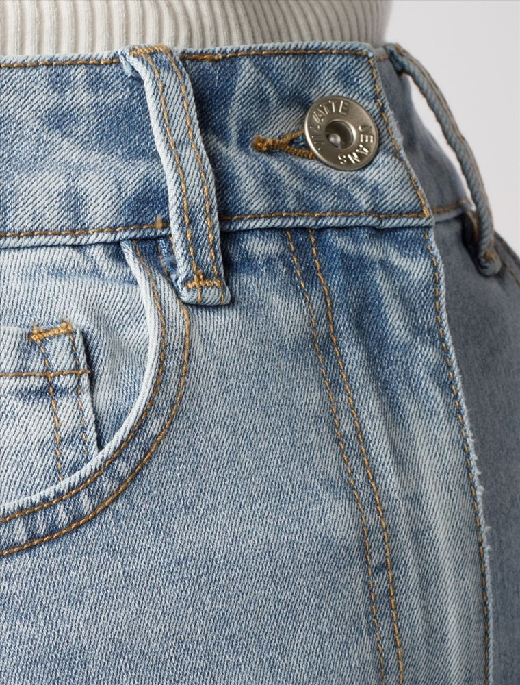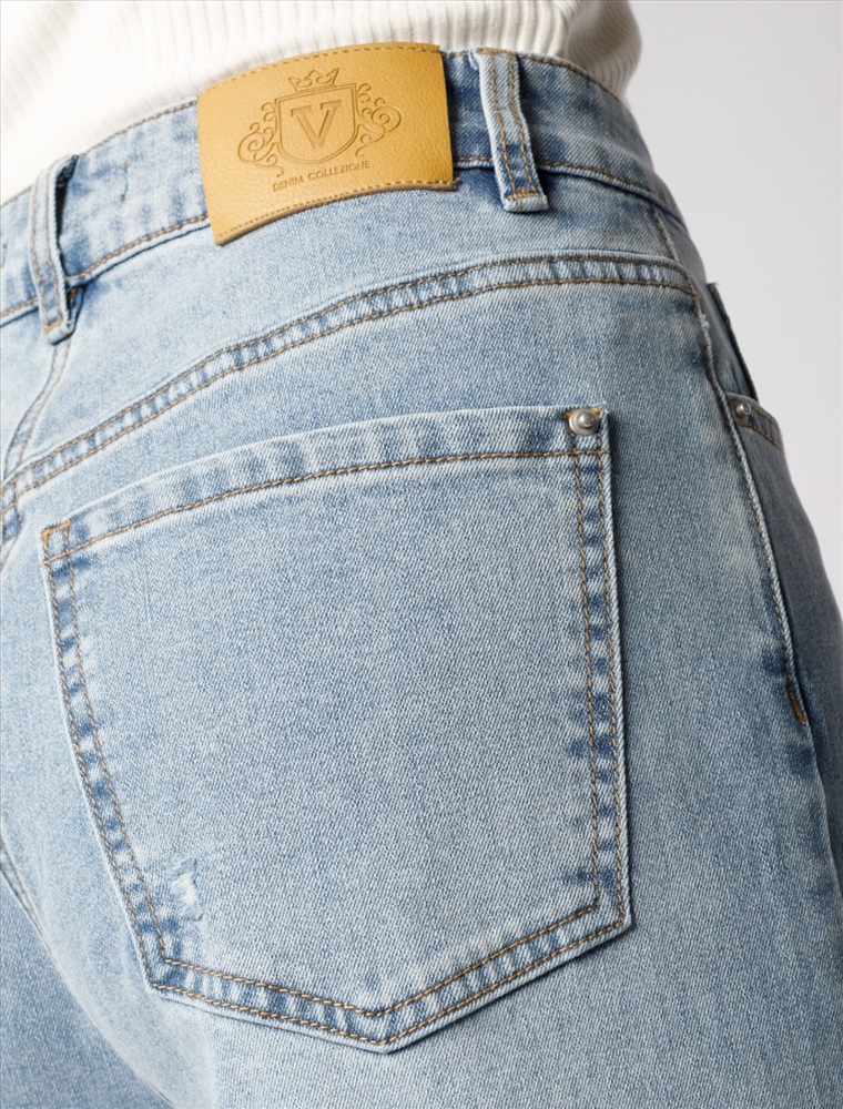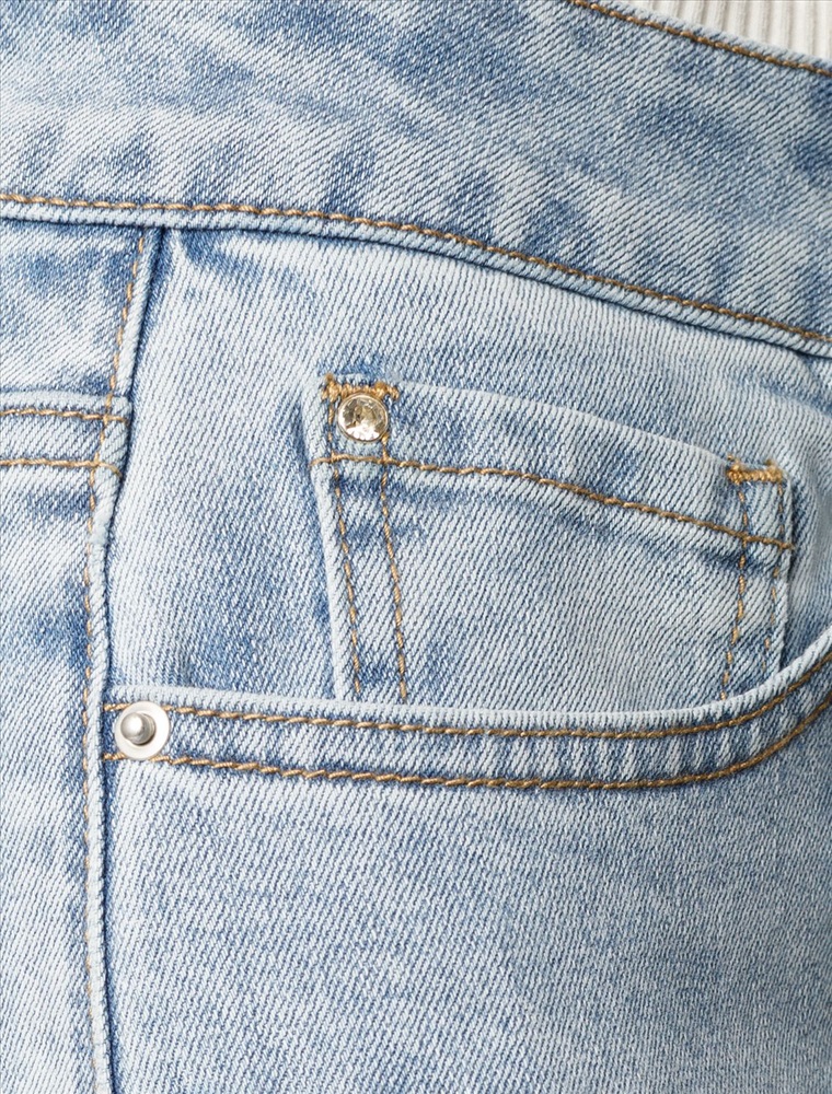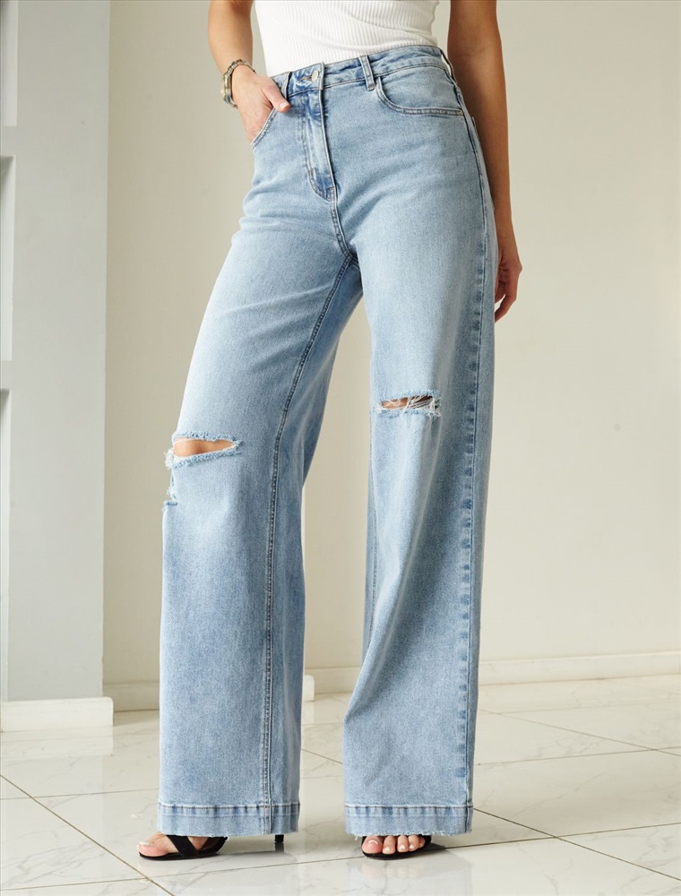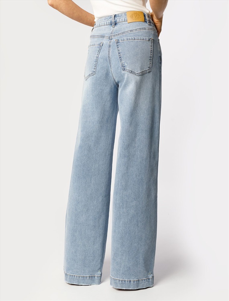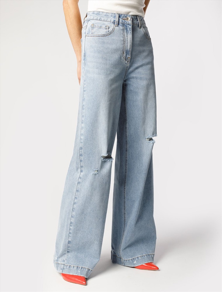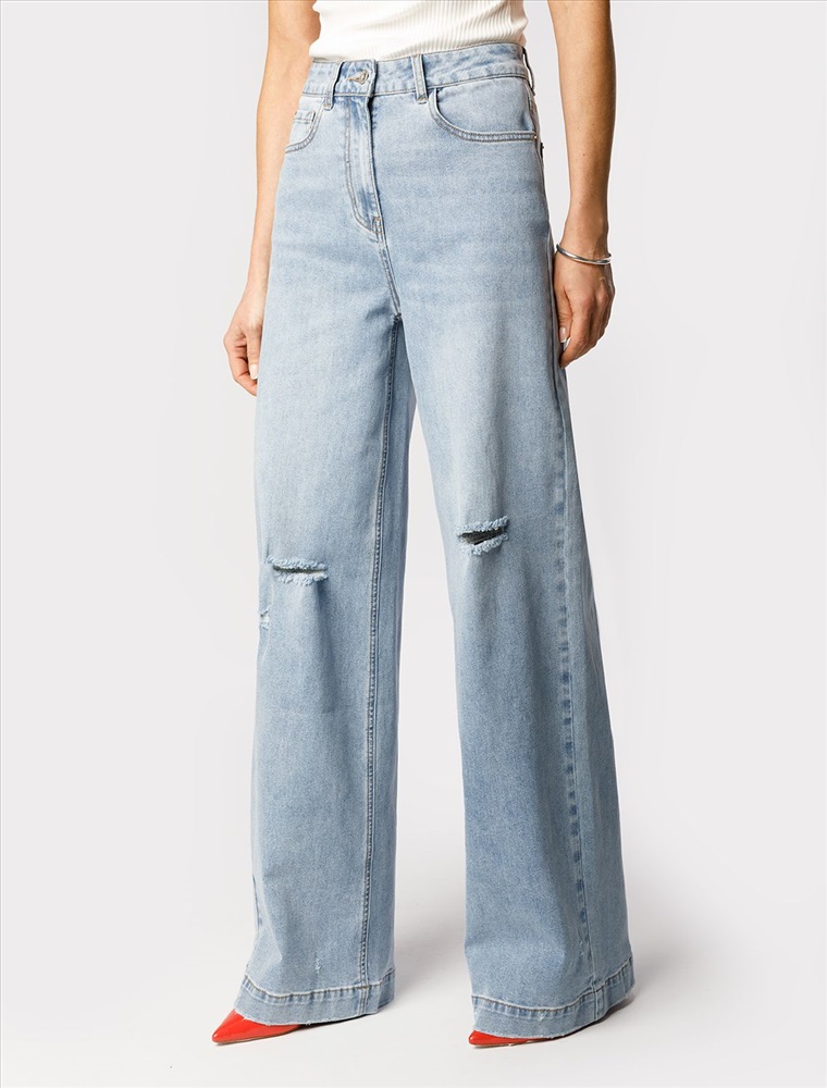 Джинсы-трубы в голубом оттенке выполнены из эластичного денима. Модель с эффектной стиркой и трендовыми декоративными равными элементами. За счет высокой посадки на талии и свободного силуэта, модель вытягивает силуэт, визуально стройнит и подходит для любой фигуры. Изделие дополнено брендированным патчем.