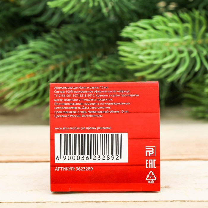 Производитель: Банная забава; Габариты: 6 x 6 x 10; Страна: Россия; В боксе: 28 шт; Состав: См. на упаковке; Материалы: см. на упаковке; Фасовка: по 1 шт; Индивидуальная упаковка: Подарочная упаковка; Сертификат: ЕАС; Набор: Нет; Объём, мл: 15; Тематика праздника: Новый год; Аромат: Тимьян (чабрец); Группа ароматов: Трава