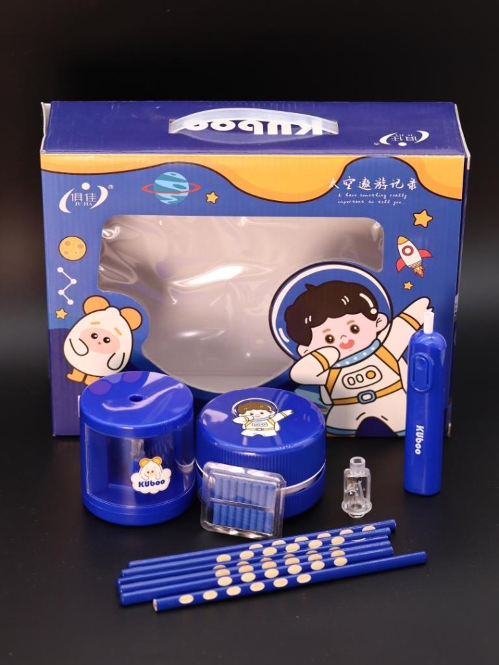 Ширина, см: 27,0 Высота, см: 21,5 Страна производства: Китай Размер упаковки, см: 21.5 × 27 × 8 Материал: Пластик, металл Штрихкод: 4670284419902 Индивидуальная упаковка: Картонная коробка Электрический канцелярский набор в космическом стиле — идеальный выбор для школьников и студентов! В комплект входят 6 простых карандашей, электрическая точилка (работает от батареек AA) с одной сменной насадкой, электрическая стирательная резинка (работает от батареек AAA), мини-ластики (16 шт.) и мини-пылесос для уборки рабочего пространства (работает от батареек AA). Оформленный в насыщенных синих тонах с милым астронавтом и тематическими элементами, этот набор вдохновляет на новые открытия и делает учёбу более увлекательной. Функциональные инструменты помогут легко затачивать карандаши, аккуратно стирать записи и поддерживать чистоту на рабочем столе. Отличный подарок для любителей стильных и удобных канцелярских принадлежностей! Размер упаковки: 21,5 x 27 x 8 см. Батарейки в комплект не входят! Комментарии к товару