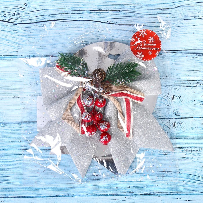 Серебристый текстильный бант с элементами шишек и ягод в скандинавском стиле станет элегантным украшением новогодней ёлки. Мягкая фактура и сдержанный оттенок создают атмосферу зимней свежести и спокойствия, подчёркивая природную красоту праздничного интерьера.