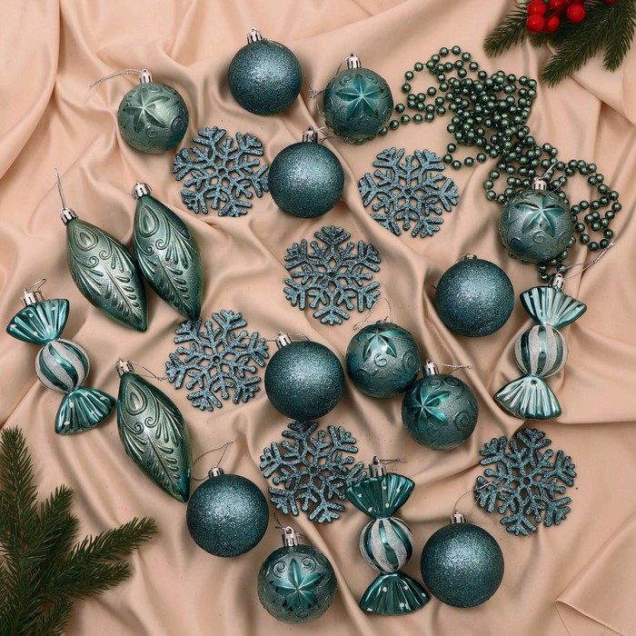 Новогодние игрушки «Чудесный день» — это разнообразный и мягкий набор для украшения ёлки в зелёной гамме. В комплекте 25 пластиковых элементов разных форм: шары, снежинки, леденцы, бусы, сосульки и конфеты. Все детали однотонные и выполнены в духе сразу нескольких стилей: шебби-шик, новогоднее барокко, скандинавский дизайн, датский минимализм и фьюжн. Это универсальный выбор для тех, кто любит создавать праздничную атмосферу с акцентом на свет, форму и зимнюю гармонию.