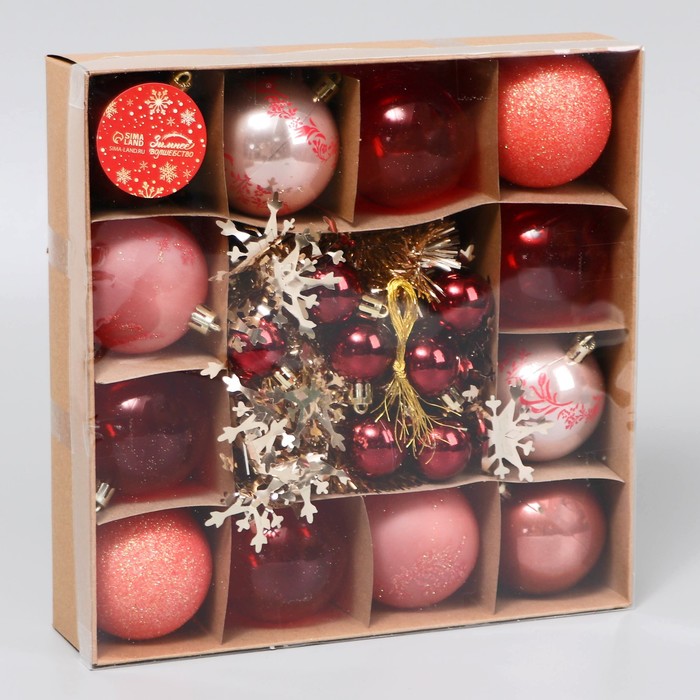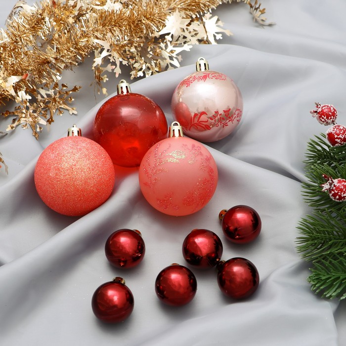 Набор из 21 новогоднего шара двух размеров — 6 и 2,5 см — выполнен в стиле фьюжн с однотонным красным и прозрачным оформлением. В комплект входит 1 метр мишуры, которая дополняет праздничный декор, создавая эффект лёгкости и динамики на ёлке.