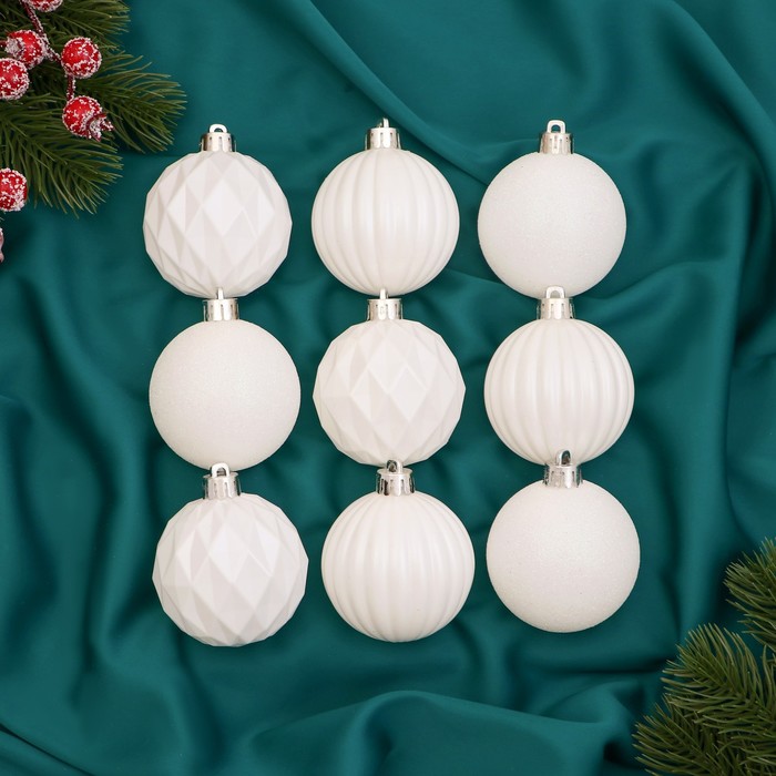Габариты: 17,5 x 17,5 x 5,8 Страна: Китай В боксе: 36 набор В наборе: 9 набор Состав: Пластик Материалы: пластик Фасовка: по 1 набор Индивидуальная упаковка: Пластиковая коробка Сертификат: Не подлежит сертификации Набор: Да Цвет: Белый Диаметр шара, см: 6 В наборе, шт.: 9 Символ года: Нет Тематика праздника: Новый год Материал: Пластик Стиль: Датский, Классика, Скандинавский, Ар-деко Пластиковые новогодние шары белого цвета с гранёной поверхностью — это стильное и лаконичное решение для праздничного украшения ёлки. Игрушки диаметром 6 см выполнены в классической форме, но благодаря текстуре выглядят современно и интересно. Набор из 9 элементов подходит под разные стили оформления: от строгой классики до датского минимализма. Преимущества