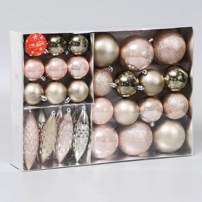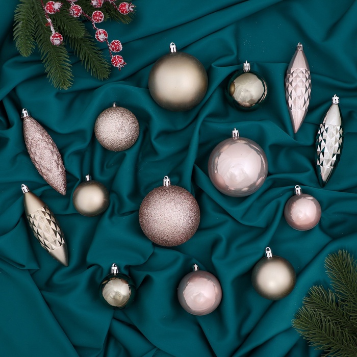 Набор из 31 однотонного пластикового украшения для новогодней ёлки выполнен в нежной цветовой гамме и стиле шебби-шик. Эти элементы создают лёгкую и уютную атмосферу, подчёркивая изящество праздничного интерьера.