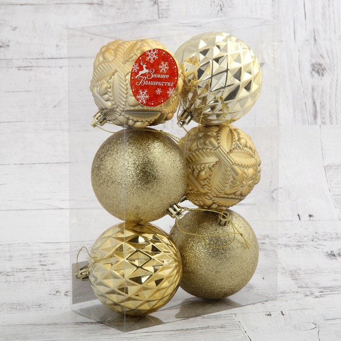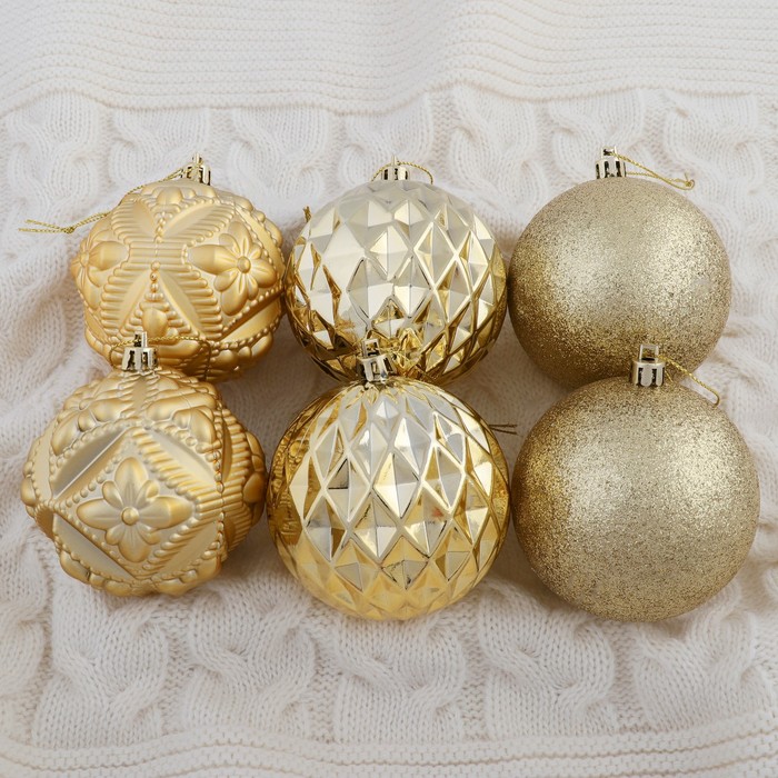 Набор из шести золотых шаров диаметром 8 см создаёт атмосферу праздничного великолепия и утончённого шика. Эти украшения в стиле ар-деко и новогоднего барокко придают интерьеру нотки роскоши и timeless-элегантности. Монохромное золотое покрытие равномерно отражает свет гирлянд, наполняя пространство тёплым сиянием и создавая ощущение сказочного торжества.