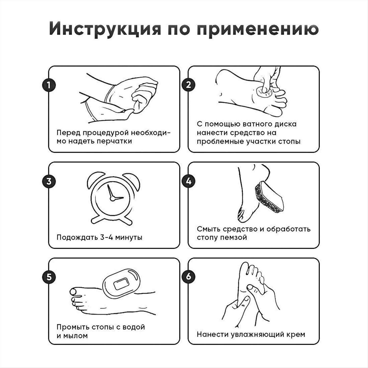 Нанести средство на ватный диск, приложить на проблемные участки стоп на 3-5 минут. Смыть средство и обработать пемзой размягченную кожу стоп. Промыть стопы водой с мылом и нанести увлажняющий крем для ног от Epil Profi для получения максимального эффекта и нейтрализации щелочи (кислоты в составе крема останавливают химическую реакцию, чтобы не повредить здоровую кожу стоп).