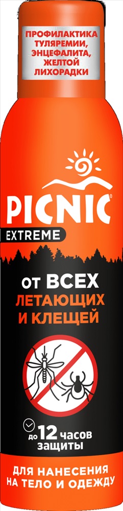 Picnic Extreme — обеспечивает продолжительную защиту до 12 часов от всех видов летающих кровососущих насекомых: комаров, клещей москитов, мошек, мокрецов, слепней, ос, оводов и т.д. в условиях их максимального скопления. В состав входит натуральное масло эвкалипта, которое отпугивает насекомых и ухаживает за кожей.