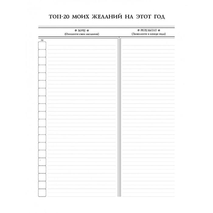 Ежедневник №1 - это интересный проект с уникальным контентом. С ним вы сможете не только эффективно составлять планы на день, месяц и год, каждый день здесь предусмотрено место для записи самых интересных идей, для планов о вознаграждении себя за хорошую работу, для планов на ночь. Здесь есть, где фиксировать названия книг, песен или фильмов дня. Это невероятное продуманный и удобный ежедневник, планнер и дневник в одном компактном блокноте, который удобно носить с собой. Воспользуйтесь его преимуществами, чтобы сделать вашу жизнь более интересной, гармоничной и сбалансированной.