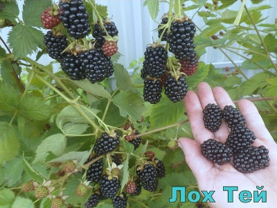 Ежевика беспишая Лох Тей куст высотой до 300 см. Плоды крупные 9 гр., овальной формы, цвет черный, на вкус кисло-сладкие. Период созревания с июня месяца. Ежевика полна витаминами и полезными свойствами. Её используют в приготовлении варенья, джемов. Сорт Лох Тей ароматное растение которое заполнит ваш сад ароматом и красотой.