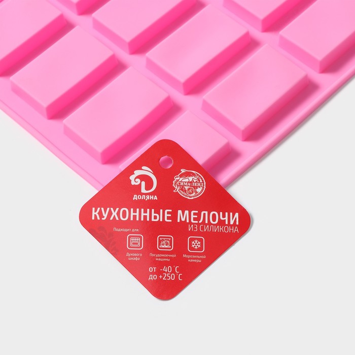 Производитель: Доляна; Габариты: 29 x 17 x 1; Страна: Китай; В боксе: 200 шт; Состав: Силикон; Материалы: силикон; Фасовка: по 1 шт; Индивидуальная упаковка: Без упаковки; Габариты товара: 29 см × 17 см × 1 см; Сертификат: СТР; Набор: Нет; Цвет: Розовый; Количество ячеек: 20; Рисунок: Нет; Тематика праздника: Универсальная тематика; Материал: Силикон; Тип покрытия: Без покрытия; Ячейки: Да; Наличие палочек для форм: Нет; Тип формы: Для шоколада; Разъёмная форма: Нет; Съёмное дно: Нет; Тематика: Геометрические фигуры; Форма: Мини-плитка; Можно мыть в посудомоечной машине: Да; Фиксированная цена: Да
