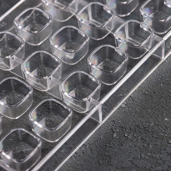 Производитель: KONFINETTA; Габариты: 33 x 16 x 2,5; Страна: Китай; В боксе: 72 шт; Состав: Пластик; Материалы: пластик; Фасовка: по 1 шт; Индивидуальная упаковка: Блистер; Габариты товара: 33 см × 16,5 см × 3 см; Сертификат: СТР; Набор: Нет; Цвет: Прозрачный; Количество ячеек: 21; Рисунок: Нет; Крышка: Нет; Тематика праздника: Универсальная тематика; Материал: Пластик; Тип покрытия: Без покрытия; Для детей до 3 лет: Нет; Тематика: Геометрические фигуры; Форма: Конфета