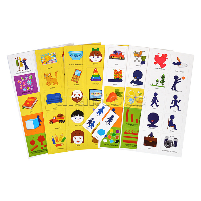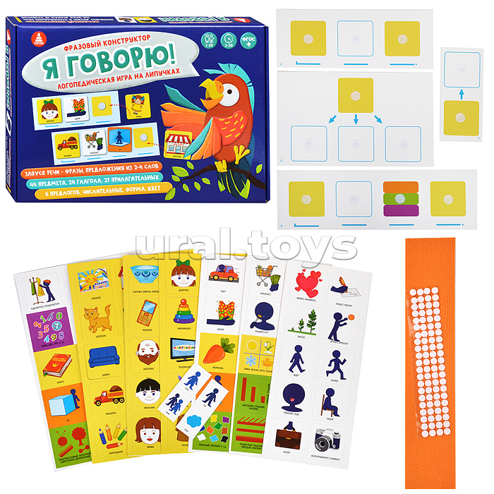 Наличие: >10 Логопедическая игра "Фразовый конструктор на липучках "Я говорю" поможет в становлении речи ребенка на самых ранних этапах развития и на этапах ее совершенствования. Комплектность: 4 схемы предложений, 4 схемы местоимений, лист ковролина для составления длинных предложений, 80 карт с изображениями предметов, их действий, признаков и 97 липучек. Комментарии к товару